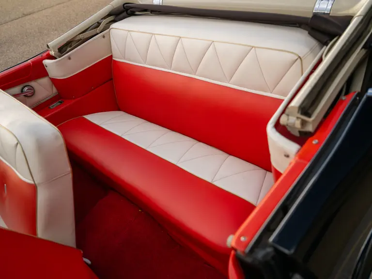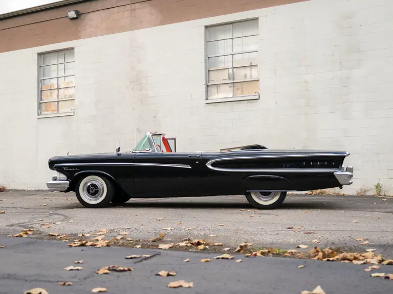 This Edsel Pacer Convertible is one of just 1,876 produced for 1958, making it by far the rarest Pacer variant that model year. Finished in black with a matching convertible top, it typifies the maverick brand’s unconventional design ethos, with its mashup of a classical upright grille and then-trendy tailfins. The potent 361-cubic-inch V-8 engine was factory-rated to produce an impressive 303 horsepower, giving it plenty of potency.