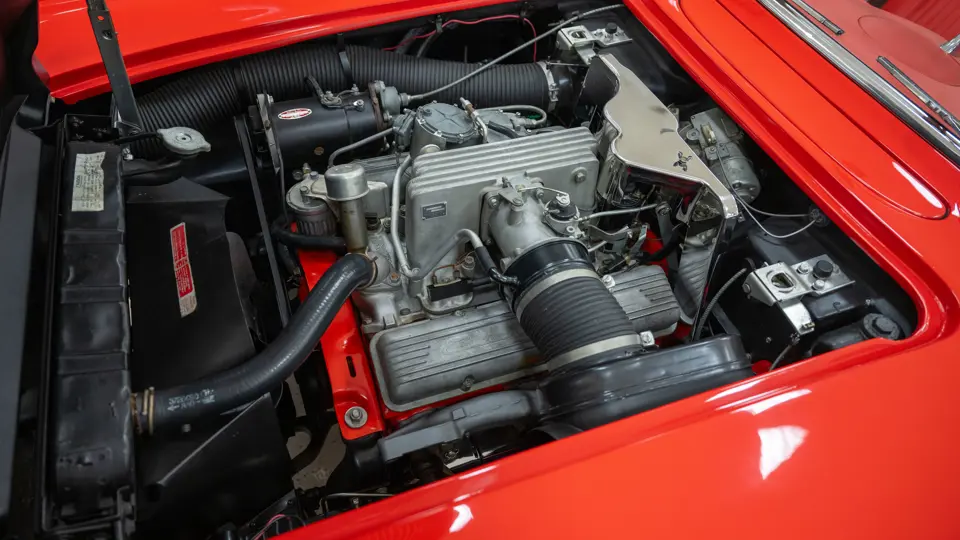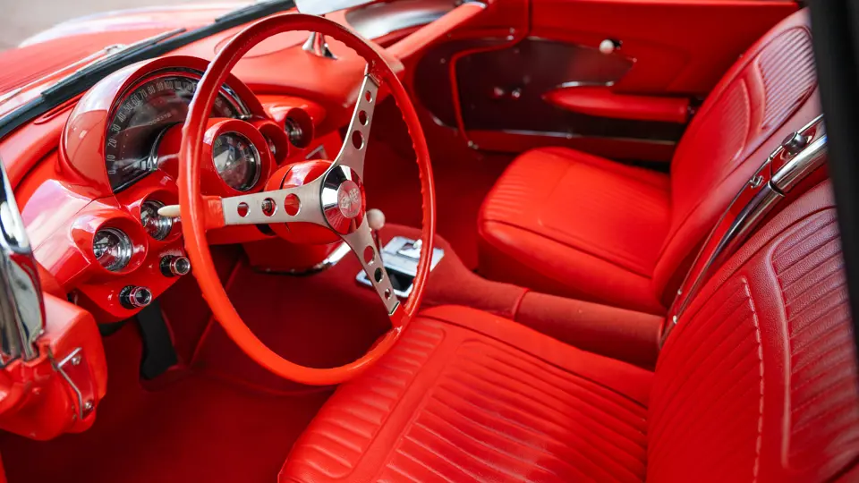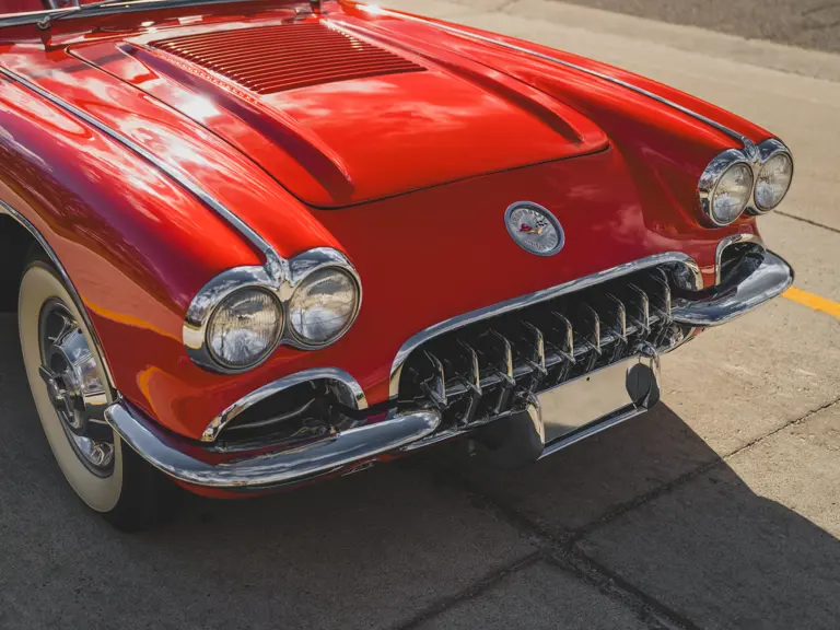 While the 1958 Corvettes remained virtually the same underneath as in 1957, their styling was all-new, with wildly popular quad headlights, a “washboard” hood with decorative simulated cooling louvers, and a rear deck lid adorned with a pair of chrome trim “tusks,” all following an industry trend of flamboyant decoration. In the cabin, a redesigned dashboard moved all instruments directly ahead of the driver, and a grab bar was fitted for the passenger to grip during what Corvette engineer Zora Arkus-Duntov would have termed “advanced handling maneuvers.”