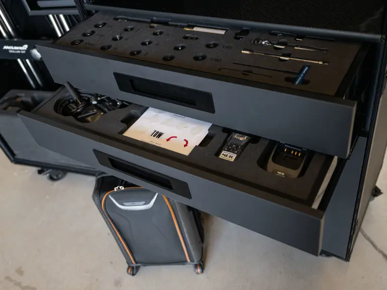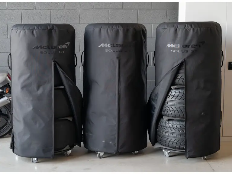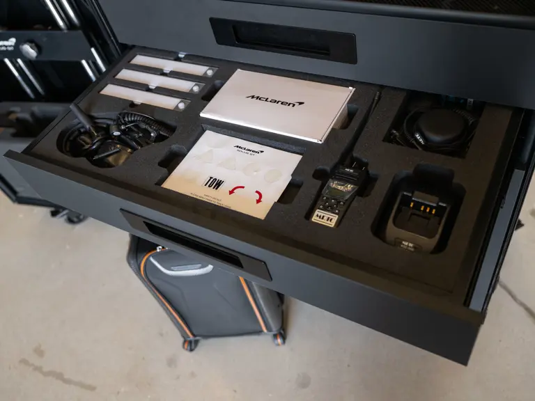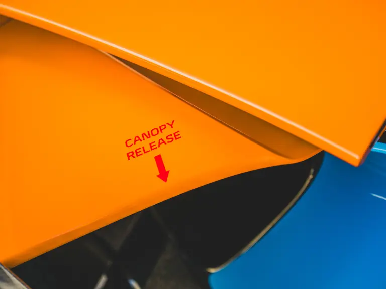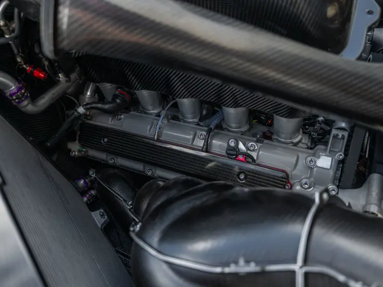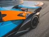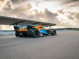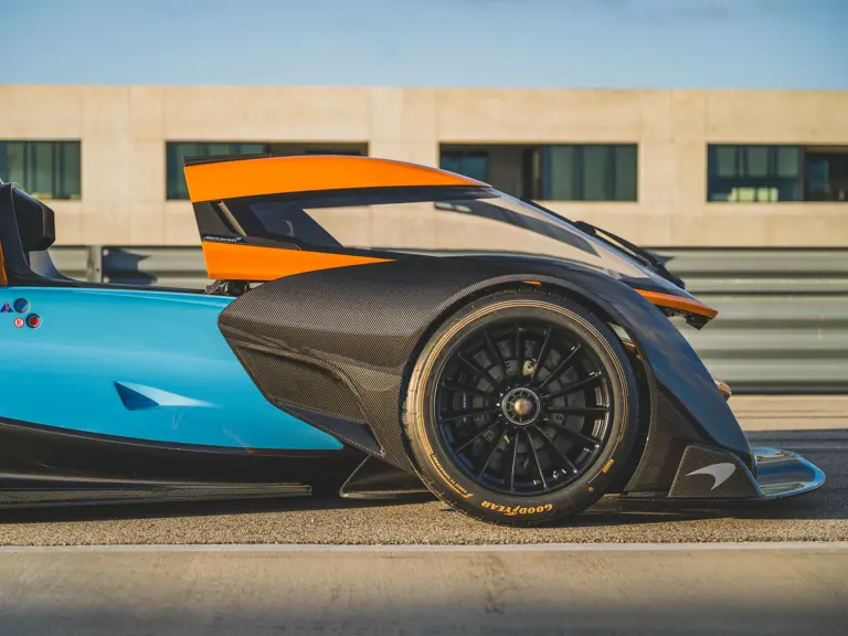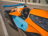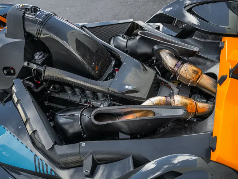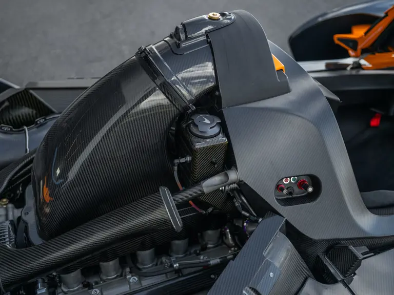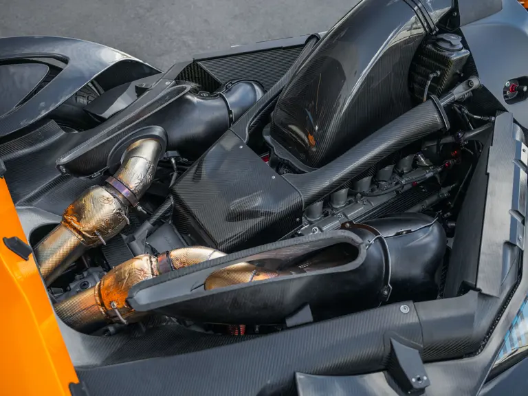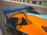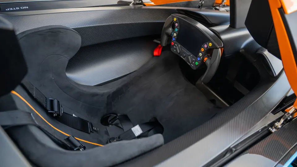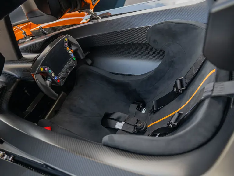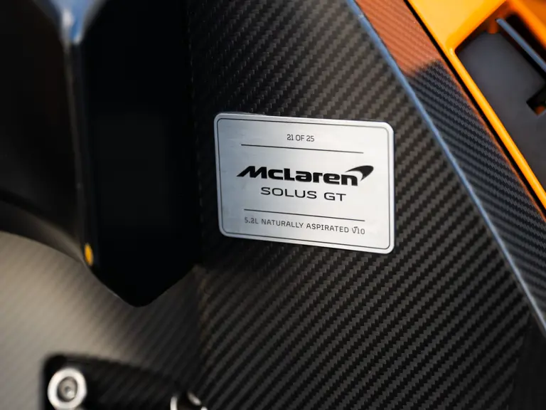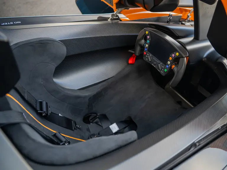 The 21st of only 25 examples constructed, this Solus GT was custom-ordered by the consignor with over $532,000 in optional equipment for a suggested retail price exceeding $3.7 million when new. Accompanying order documents confirm the inclusion of the Extended Running Kit—which alone added $90,000 to the price—along with air conditioning and an additional set of racing wheels and tires. Its carbon fiber monocoque is finished in a McLaren Special Order tri-color livery of Papaya Spark, F1 Blue, and gloss-lacquered exposed carbon fiber. Inside, the cabin is lined with satin-finished carbon fiber, Alcantara upholstery, and composite controls, all highlighted with black, blue, and McLaren orange accents that echo the car’s vibrant exterior. The central driving position offers a perfectly symmetrical view of the track, while its adjustable pedal box and steering wheel ensure ideal ergonomics. The car is accompanied by copies of its original order and purchase records.