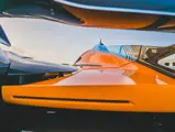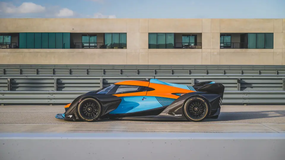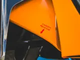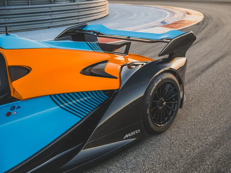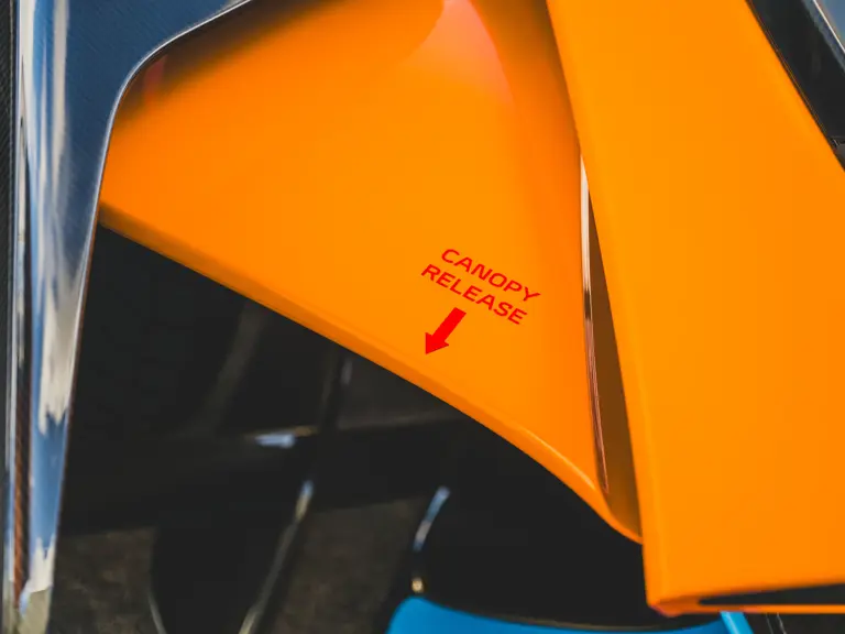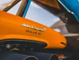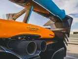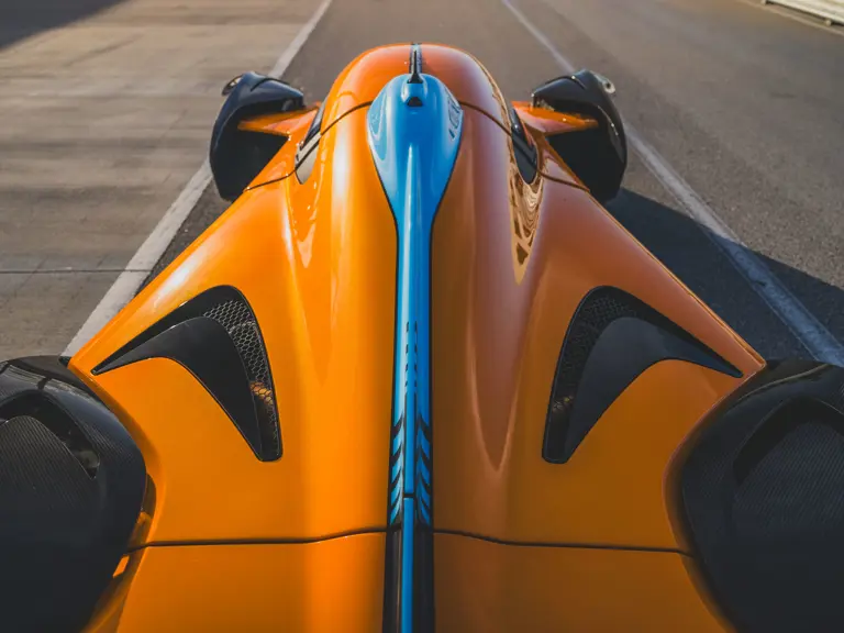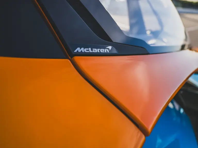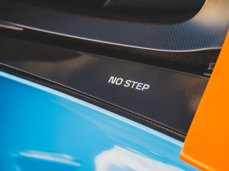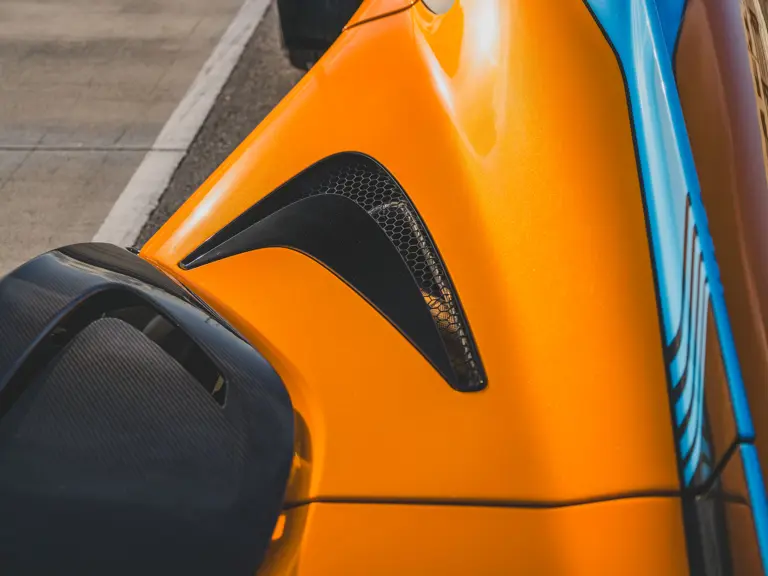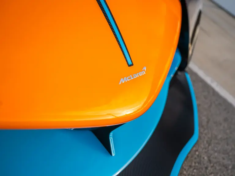 • McLaren Special Order livery of Papaya Spark, F1 Blue, and gloss-lacquered exposed carbon fiber