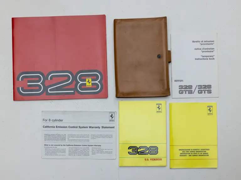 Showing 8,380 miles on the odometer at the time of cataloguing, this 328 GTB benefitted from servicing by Midwestern Auto Group of Dublin, Ohio, in February 2024. The work included a timing belt service and repairs to the brake system. In December 2025, the vehicle received new tires and a battery in addition to an annual service through Ferrari of Newport Beach. The ignition switch, hood struts, and fuel tank crossover hoses were also replaced. The Ferrari will be accompanied by tools and owner’s books, including the warranty booklet.