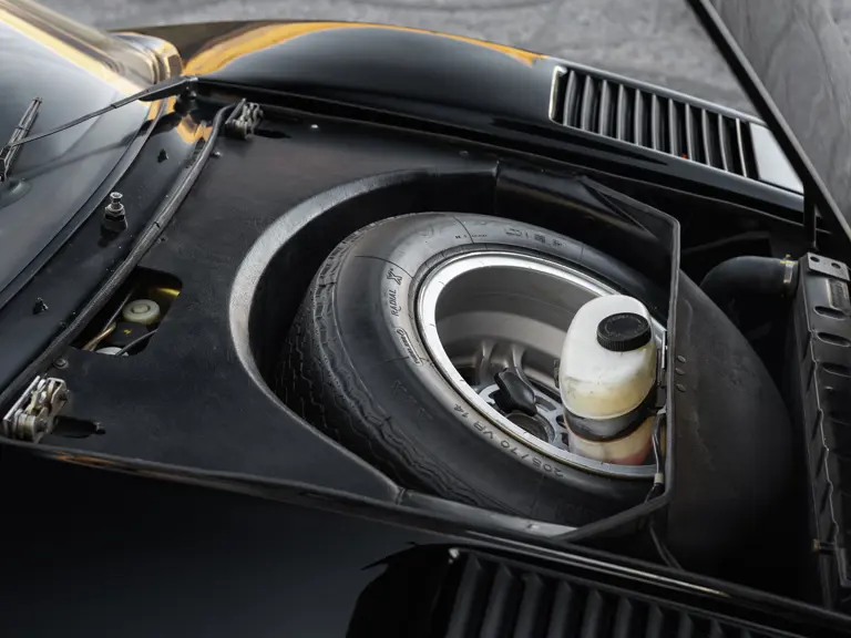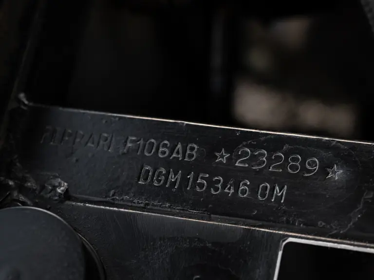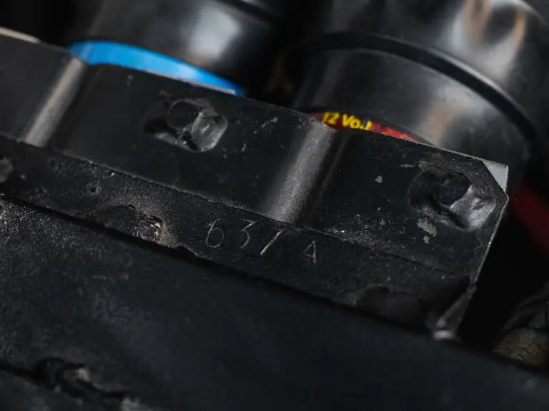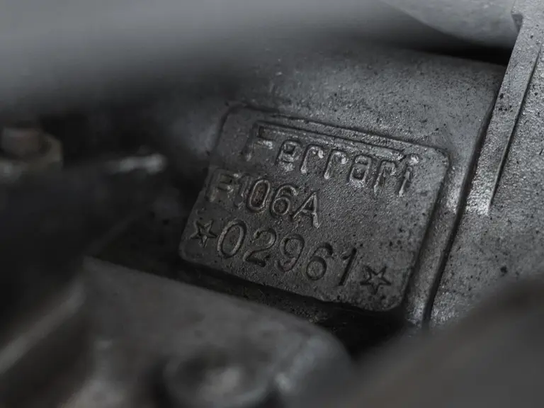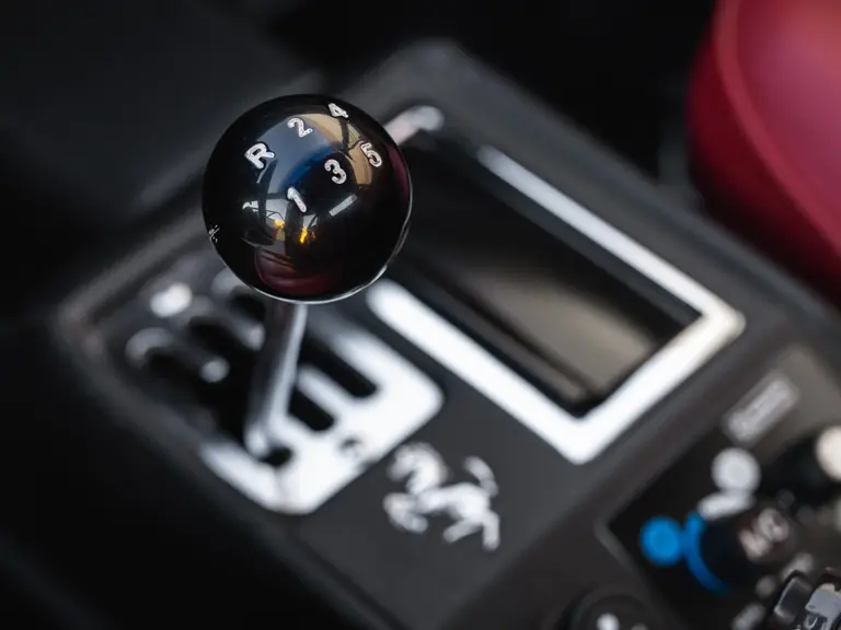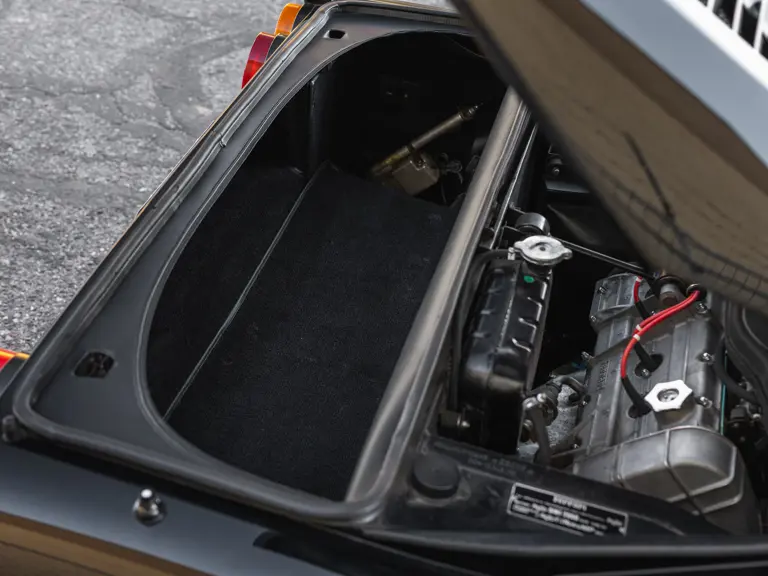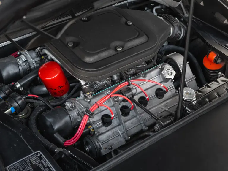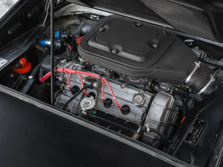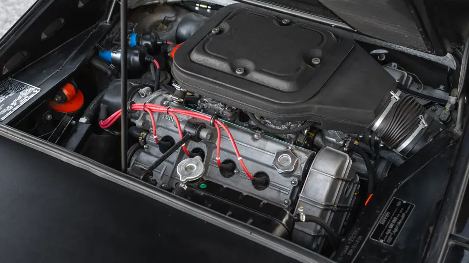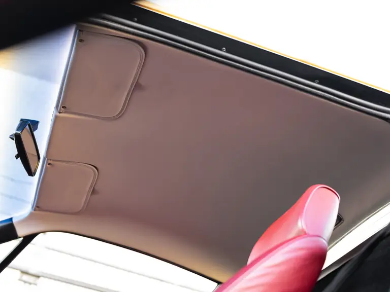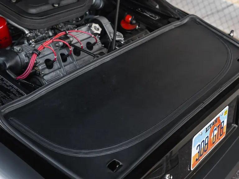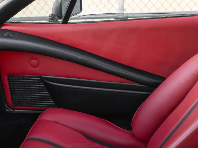 Invoices also record a major belt service in 2016 by Exclusive Motorcars of Phoenix, along with a full interior refresh that included reupholstering the seats, door panels, dashboard, center console, rear parcel shelf, and roof pillars, with the seats and door panels finished in red leather. Exclusive Motorcars installed a new clutch in 2019, while Ferrari Motor Service of Fountain Hills, Arizona, tuned the carburetor, replaced the alternator, and installed new spark plugs, among other work, in 2022. In December 2025, Wormsbacher Motor Werks of Apache Junction, Arizona, performed a timing belt service with additional work including a brake service with fresh fluid, steering and suspension tuning with new bushings, and the fitment of new rear Koni shock absorbers.