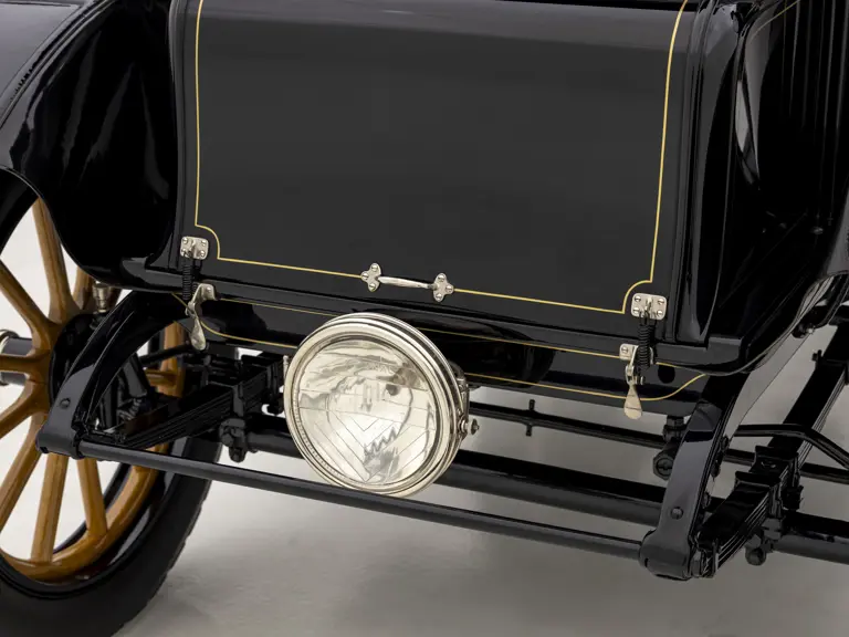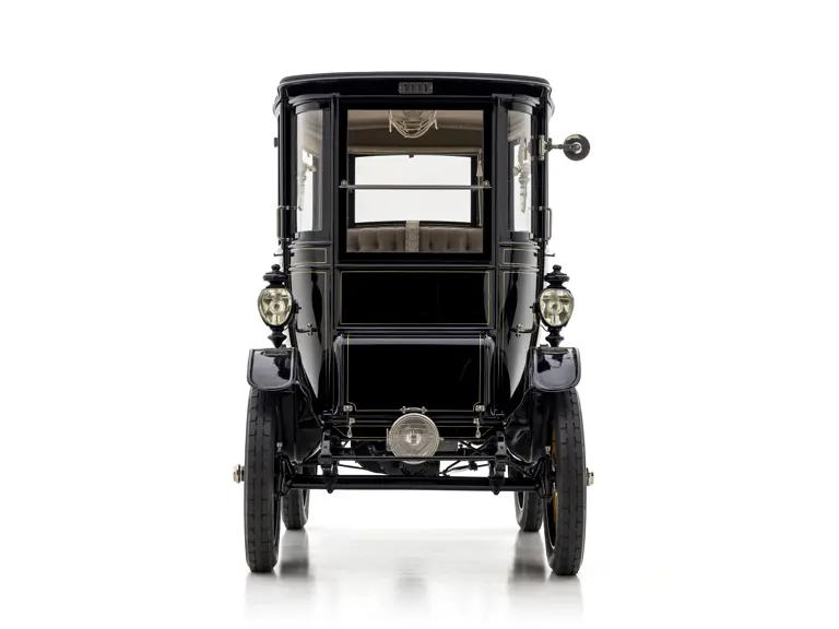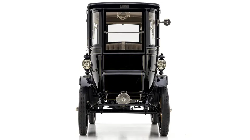The Model V offered here is a four-passenger Special Extension Coupe, the last of the truly top-of-the-line enclosed styles with the most beautiful—and lightest, and thus best-performing—aluminum bodywork, a style discontinued after this year. It is based on a light chassis with a Gruenfeldt solid rear axle and semi-elliptical leaf springs, and a 60-volt battery delivering power to a General Electric high-speed motor through a five-speed rotary controller, a sophisticated design which returned good power.
