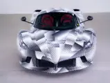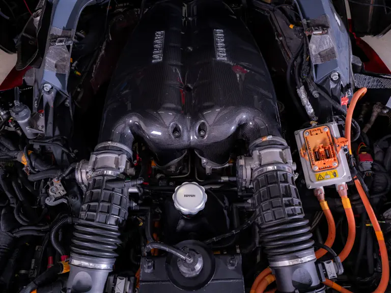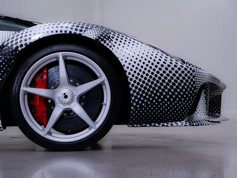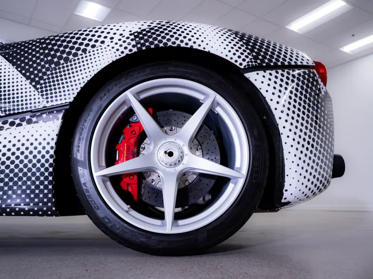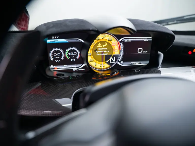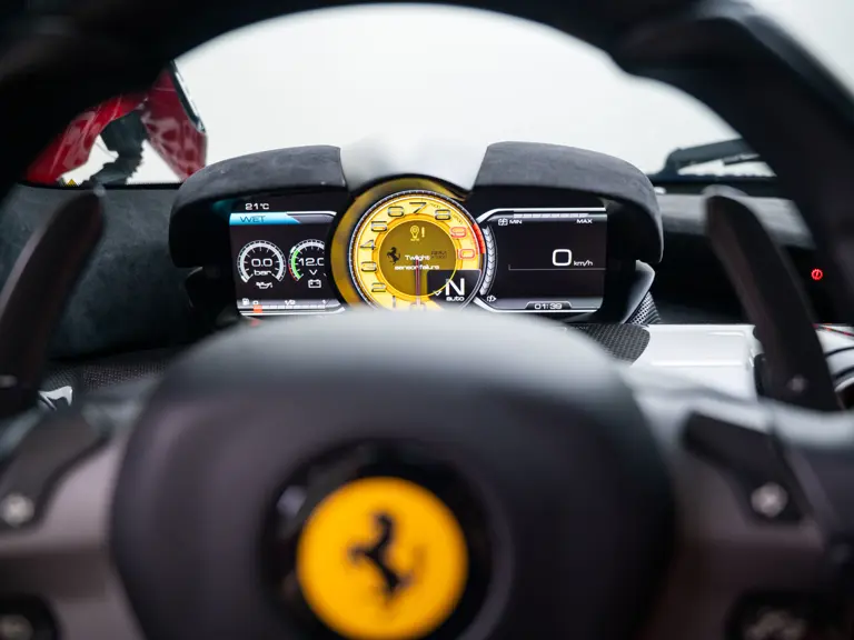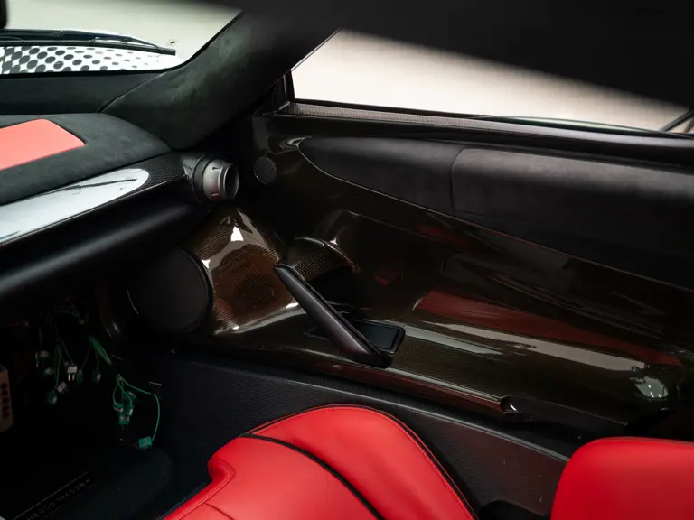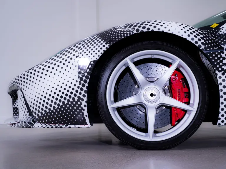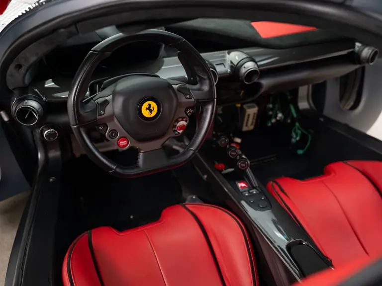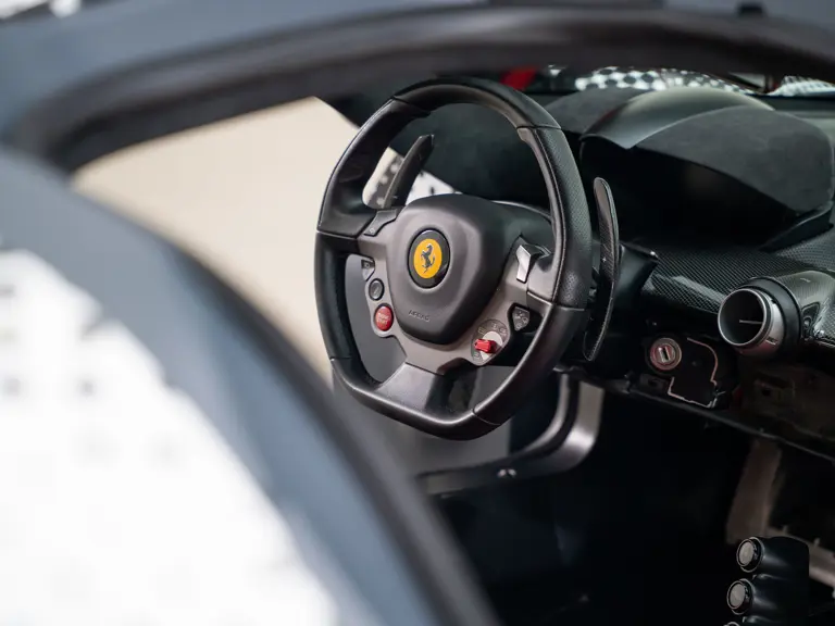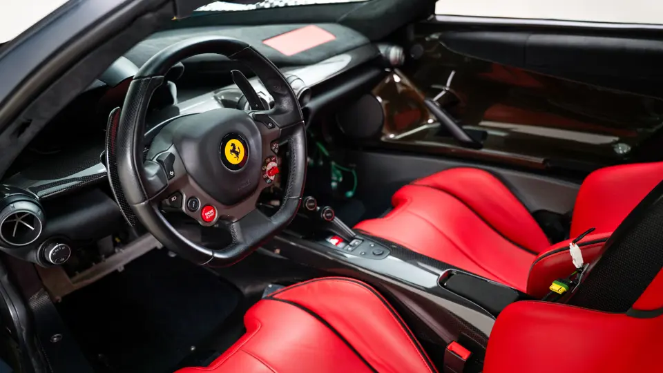 The accompanying Yellow Book records this chassis’ bodywork as Rosso with unfinished carbon fiber over Pelle Rosso, though it now wears a full camouflage wrap (as seen in pictures captured by eager spy photographers ahead of the LaFerrari’s debut). Its interior substantially resembles that of the final car, though with fascinating divergences: The steering wheel is a different shape, and decidedly non-production electrical equipment is positioned in the passenger footwell.