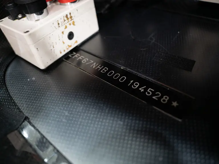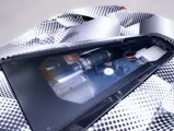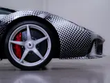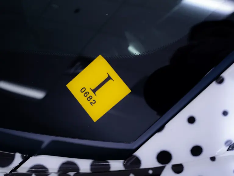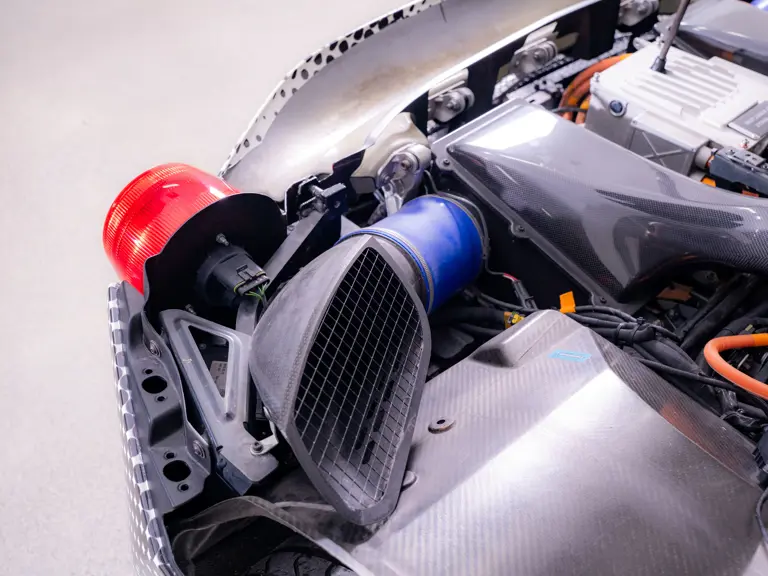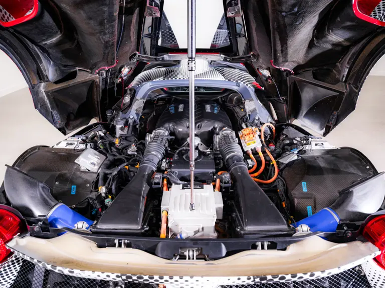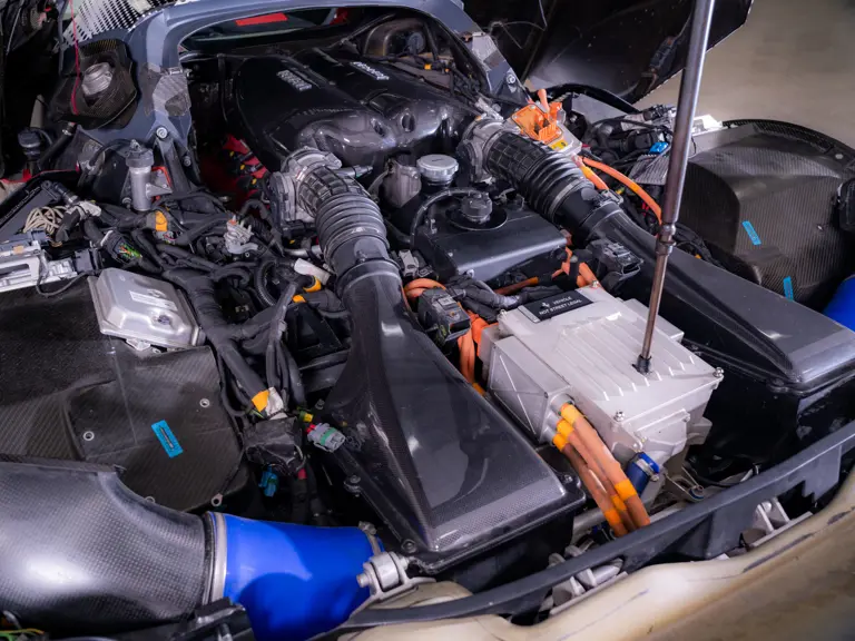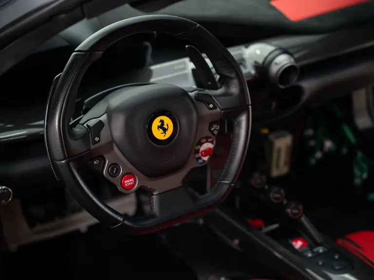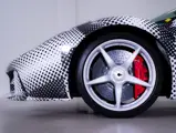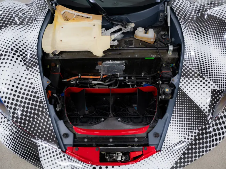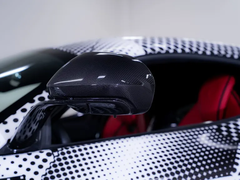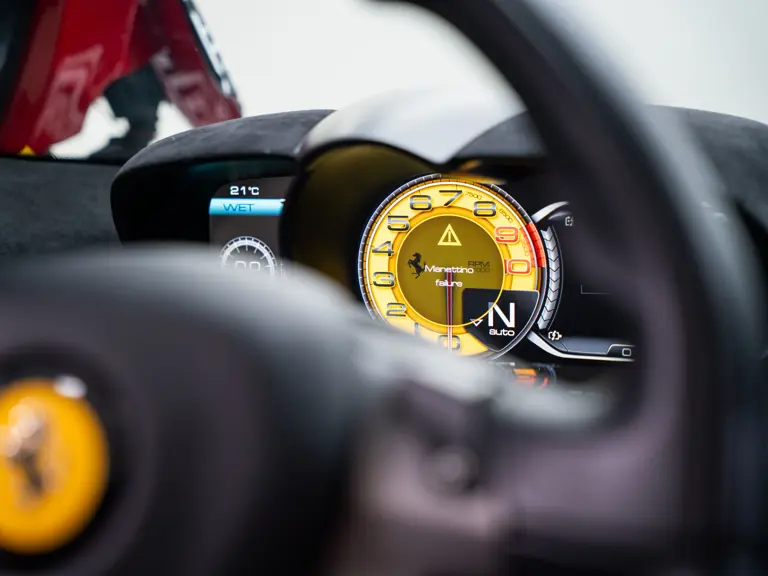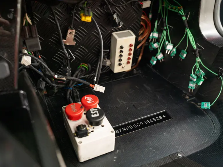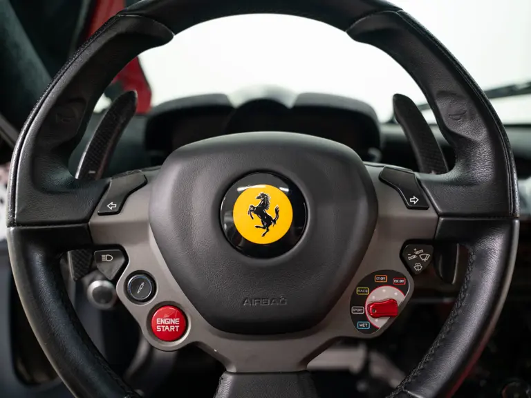 The accompanying Yellow Book records this chassis’ bodywork as Rosso with unfinished carbon fiber over Pelle Rosso, though it now wears a full camouflage wrap (as seen in pictures captured by eager spy photographers ahead of the LaFerrari’s debut). Its interior substantially resembles that of the final car, though with fascinating divergences: The steering wheel is a different shape, and decidedly non-production electrical equipment is positioned in the passenger footwell.