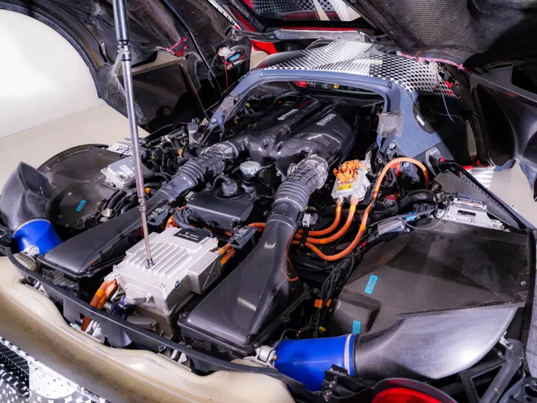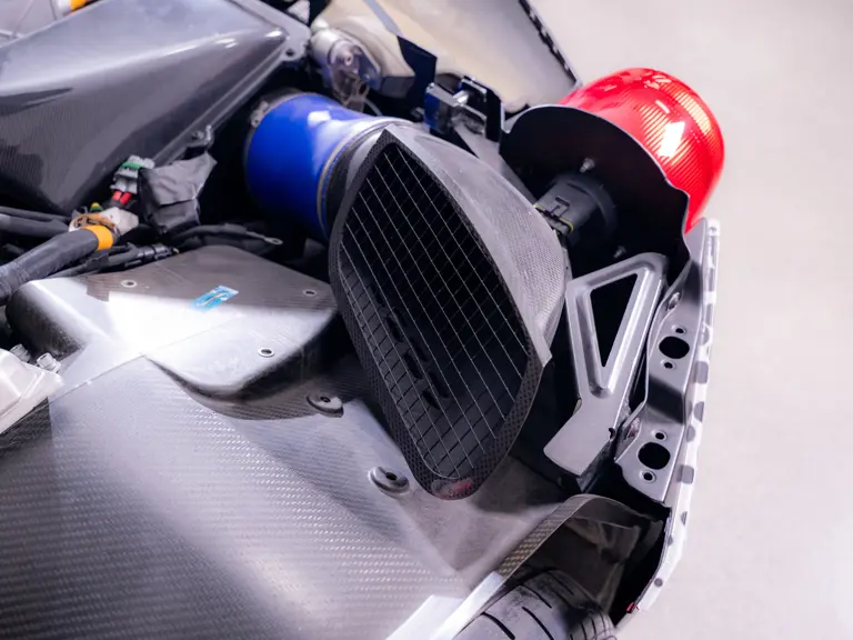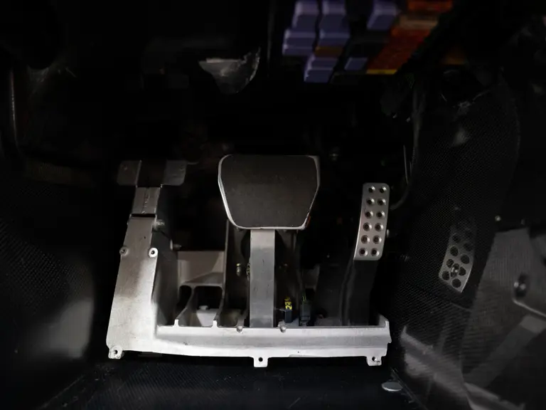 The chassis offered here is particularly noteworthy because, in its styling and underpinnings, it hews closely to the production car—yet it is powered by a naturally aspirated, 6,262-cubic-centimeter F140 FD V-12 without any version of the HY-KERS hybrid system installed. In production cars, the V-12 produced 789 horsepower out of the LaFerrari’s 950 total system horsepower; however, the rating of the engine in this prototype application is not stated.