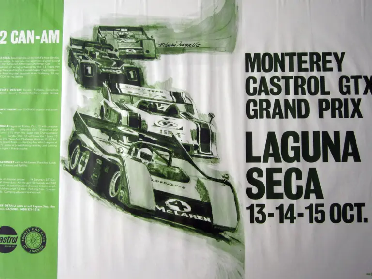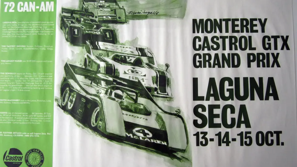72 Can Am Montery Castrol GTX Grand Prix Laguna Sexa 13-14-15 OCT, Olympia Sprints Laguna Seca 23-24 Both by artist Edwin Ingals. Some ripling in the 72 Can-am poster.