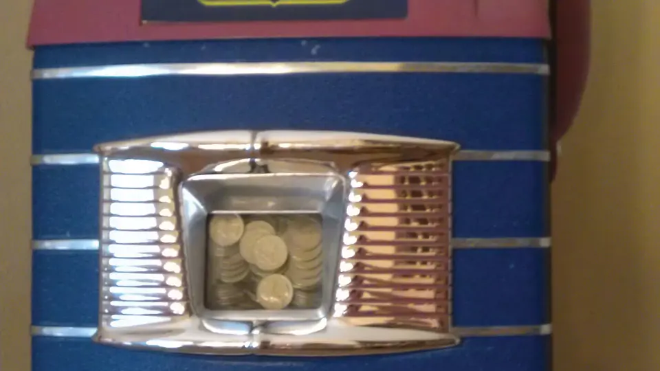1947 Mills 25 cent slot machine with jackpot, red/blue with back door, key and instruction sheet inside back door.