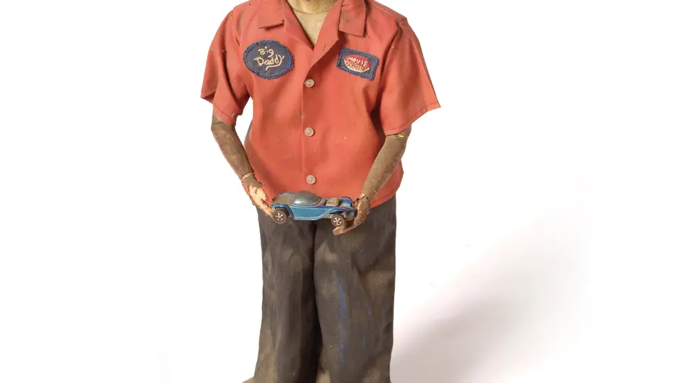 Paper mache statuette of Ed �Big Daddy� Roth figure was built by an adoring Roth fan. The piece was famously shot in the face by Von Dutch during a particularly rowdy afternoon at MovieWorld.