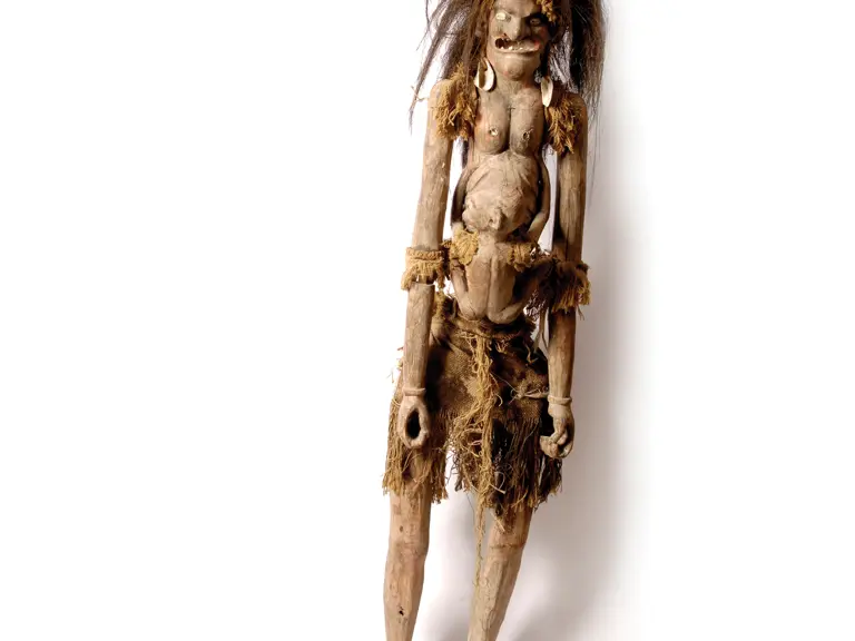Wood carved Oceanic Fertility Goddess from the shores of Borneo, brought to the States by Jesuit missionaries in the late 1940s. Over six feet tall the Goddess resided for decades in the McQueen hangar. Height: 6 ft