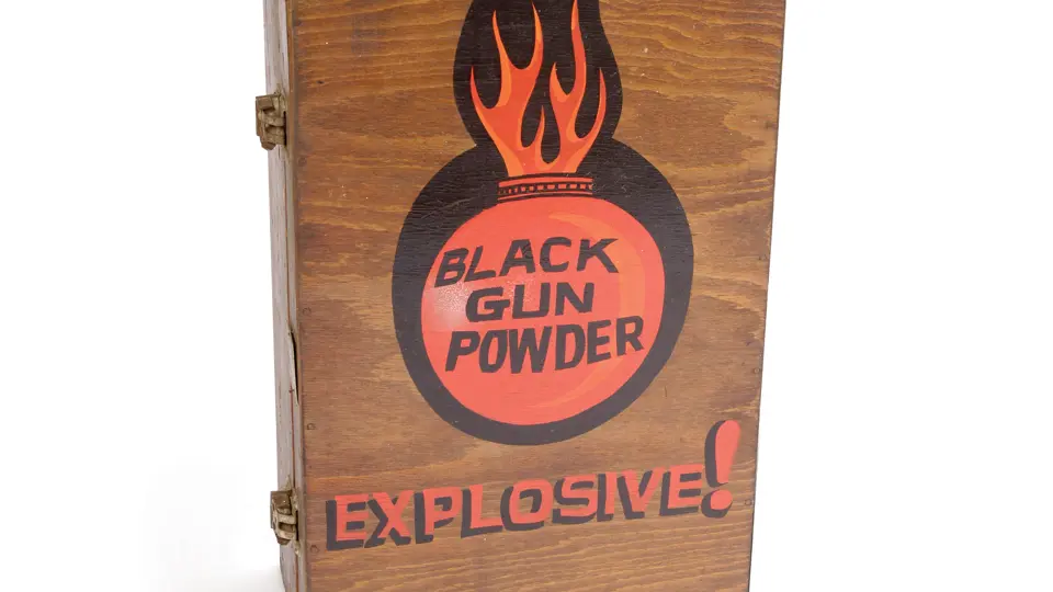 Handcrafted wooden gun powder box, built, customized and pin striped by Von Dutch for use with his guns and supplies.