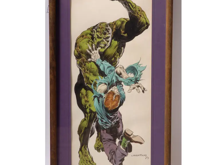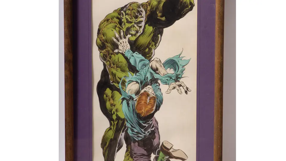 Original painting of his most famous creation Swamp Thing, c.1975, framed. Image: 21 x 9 inches.