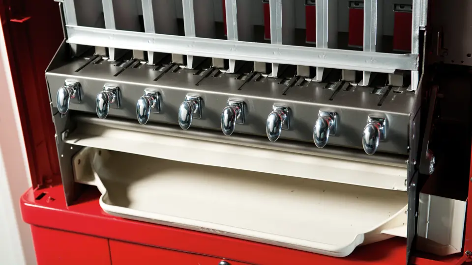 An eight-column candy vending machine painted to vend the products of Chicago’s Ferrara Pan, in fully restored and completely operational condition. Dimensions: 27 in. x 60 in. x 12 in.