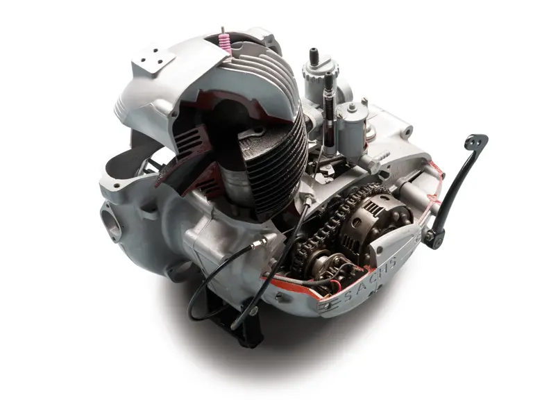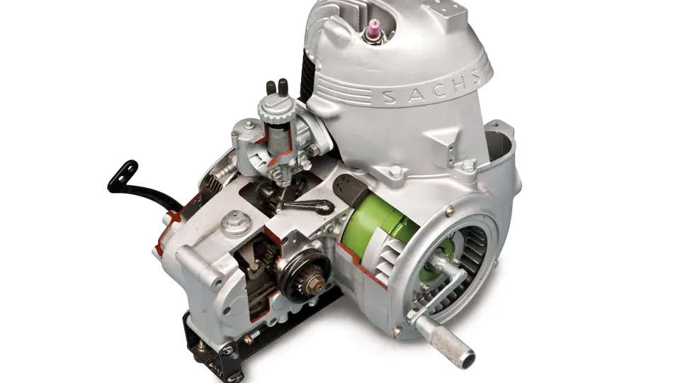 A Sachs engine, as used in the Messerschmitt microcars, cut-away so that visitors can turn the crank and watch the parts of the engine move. A terrific educational tool that is also a lot of fun. Dimensions: 15 in. x 17 in. x 16 in.