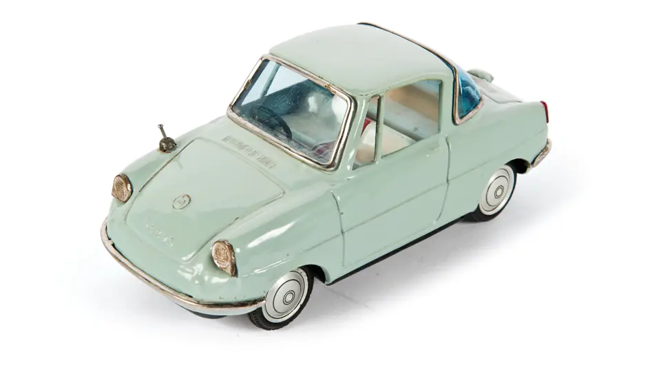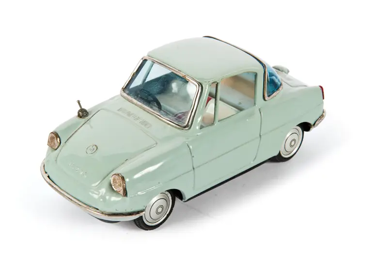 A grey, tin Mazda 360 by Banzai, in excellent condition. Length: 7 in.