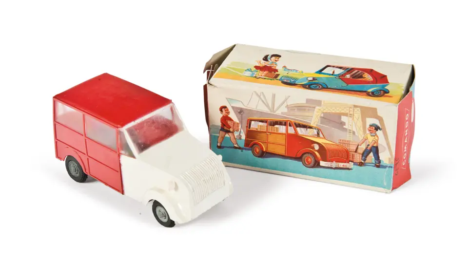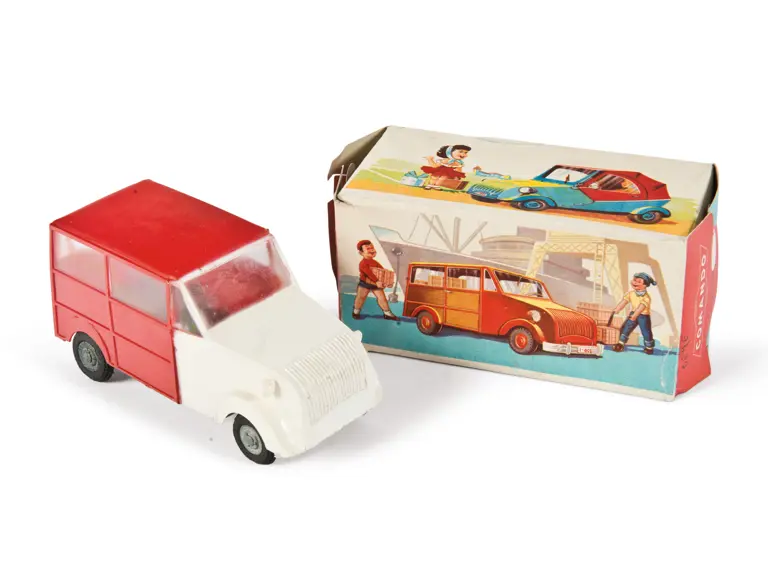 A red/white Biscuter by Comando, of Spain, with its original box. Length: 5.5 in.