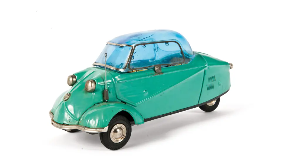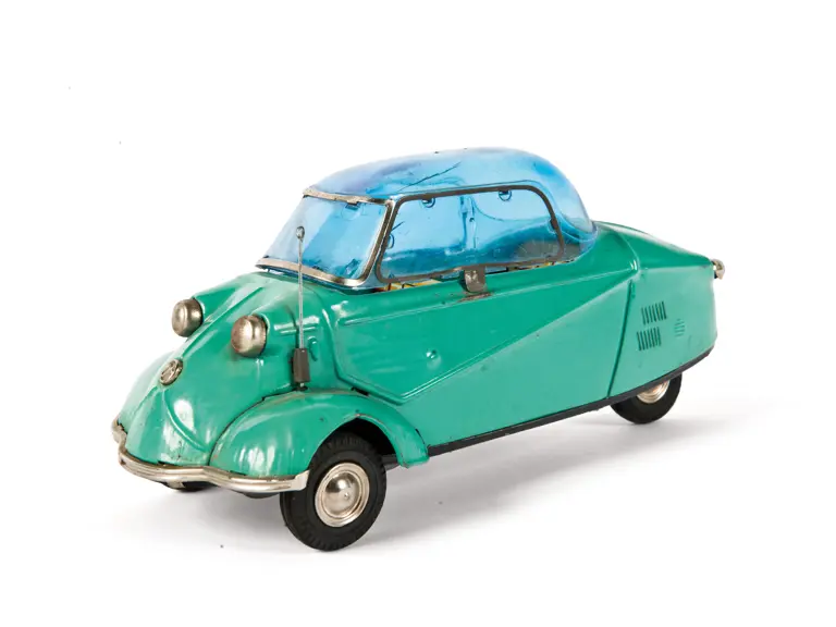 A green three-wheeler Messerschmitt by Bandai, in original condition, with some wear and small cracks to the plastic top, but it is otherwise complete. Length: 8 in.