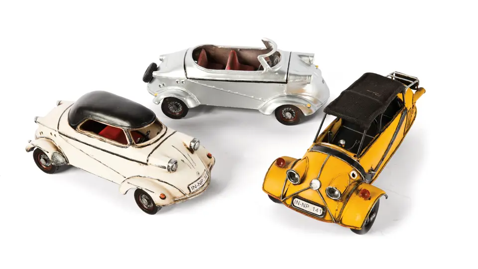 Three, artistic, handmade models of the Messerschmitt, including yellow and white three-wheelers and a silver four-wheeler, all in excellent condition. Length: approx. 11 in. (each)