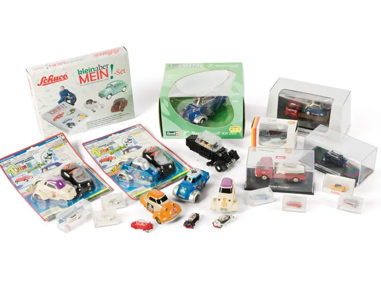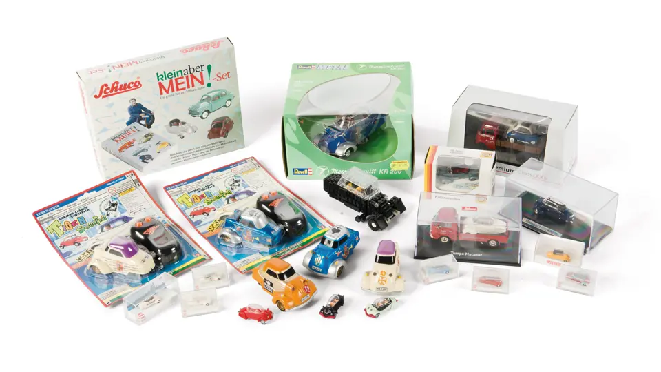 An assortment of child-oriented Messerschmitt models in a variety of different scales, including a small remote control Tiger, a 1/18-scale KR 200, a 1/87-scale Messerschmitt, and even a LEGO Messerschmitt, as well as a Schuco microcar set and a Premium ClassiXXs Isetta model.