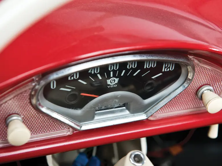 In all, only seven Goggomobil TS-300 Cabriolets were built, and the example offered here is one of two believed to be remaining in the world. This is an honest, largely original example, from the paint, which shows some sign of wear, to the lightly worn chrome and interior. It is finished in a lovely white, with a black top and boot, and a red vinyl interior. Complementing the exterior finish are white wheels with whitewall tires and hubcaps, which bear the winged Goggo emblem that leads the way down winding roads.