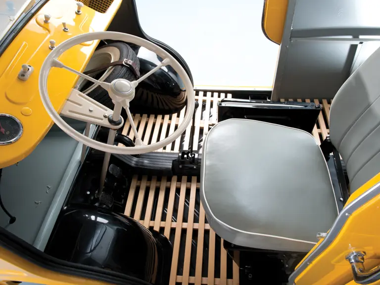 Surface treatment was pragmatic rather than styled, with stiffening debossings on flat surfaces throughout. These increased in number early on, with additional pressings ahead of the door and an additional diamond-shape between the large side rectangles. A large “G” emblem and a pointed swage line were embossed on the near-vertical nose panel. Another pragmatic note was the floor treatment consisting of removable wooden latticework sections, which isolated passengers and the load from direct contact with the floor. The load area walls were lined with hardboard. There was more useful storage space up front, with a deep wire basket in the dash and a large parcel shelf beneath the dash, this is also where the spare tire was situated.