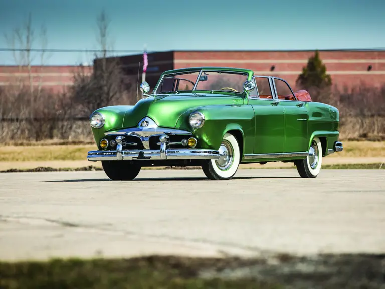 With only 230 miles since restoration and mechanical freshening; this model F51 Frazer Manhattan Convertible is driven by a 226.2-cid, 115-hp inline six-cylinder engine with the previously mentioned automatic transmission and is presented in Garden Green, complemented by a rich saddle-toned leather interior with matching top boot. The interior features green carpets, dashboard and green vinyl door panels. The interior is fitted with nicely detailed accents that can be found in the style of the windwing releases, handles, horn ring, instrumentation, seatback handrails, ashtray, radio and speaker surround. Additionally, the Manhattan also has a heater, "charging knight" hood ornament, dual KF spotlights, amber KF foglights, AM radio, guards on both bumpers, color-keyed wheels, factory wheel covers and whitewall tires. The Frazer brochure used a car presented in these colors to best illustrate their own preferred vision for the model.