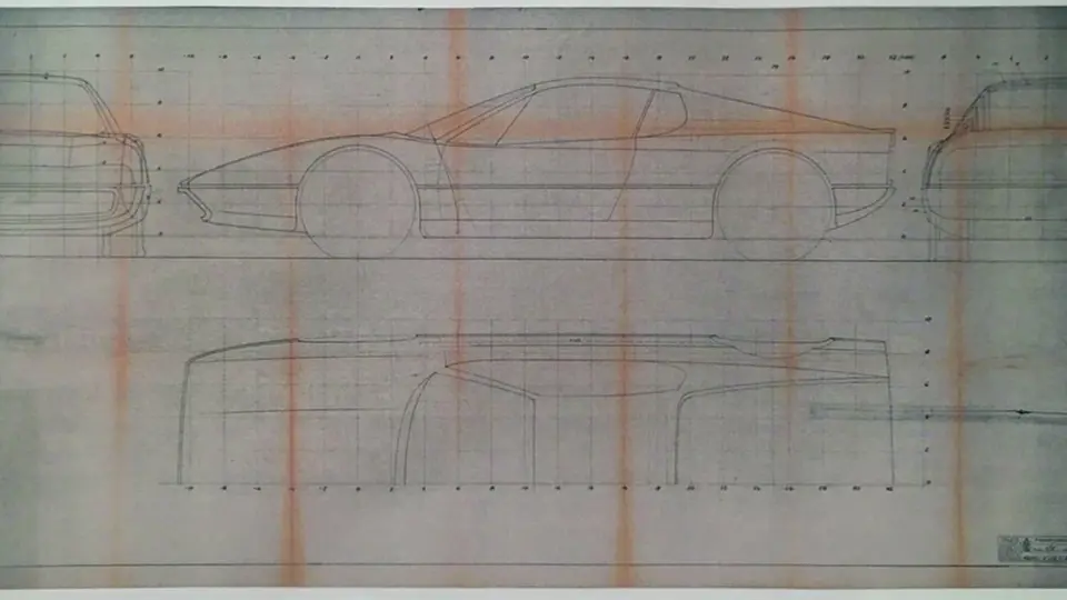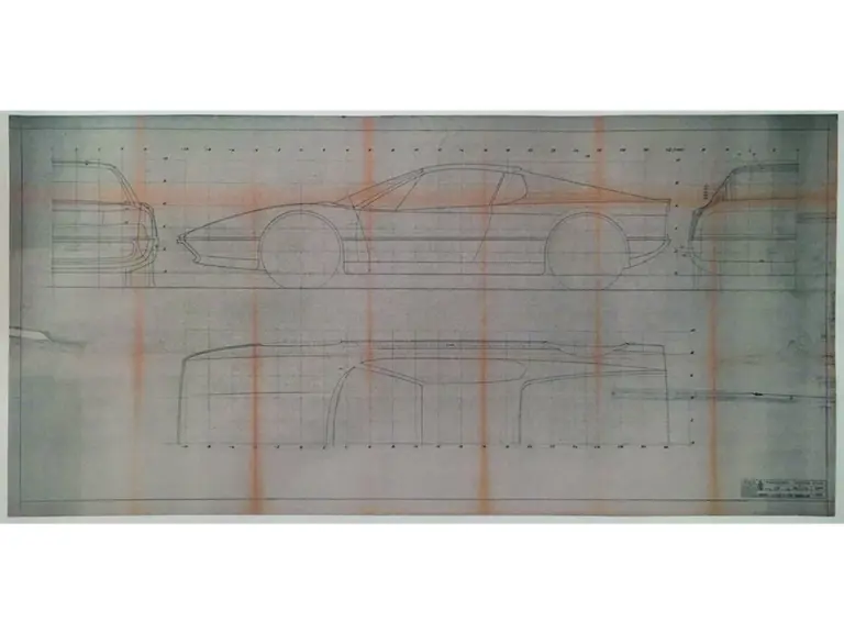 This Berlinetta Boxer 365 GT4 blueprint depicts four views: top, side, front, and rear. First introduced at the Turin Auto Show in 1971, with production beginning in 1973. 56” x 28”, linen backed.