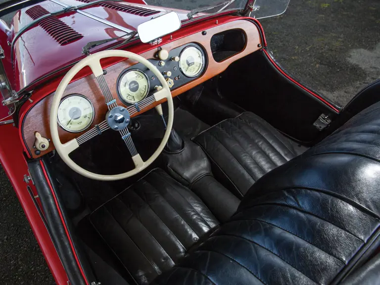Today the car is presented in red with a black interior and red top. The exterior features Maxtel fog lights, wind wings, driver mirror, and rear luggage rack. The Morgan rides on Kelly Steel Belted Metric tires that are mounted on painted wire wheels; front disc brakes bring the car to a safe stop. The simple, yet nicely appointed interior features a Bluemel Brooklands steering wheel and Smiths instrumentation. The car is accompanied by its Morgan Chassis Record and the Morgan Plus 4 instruction book.