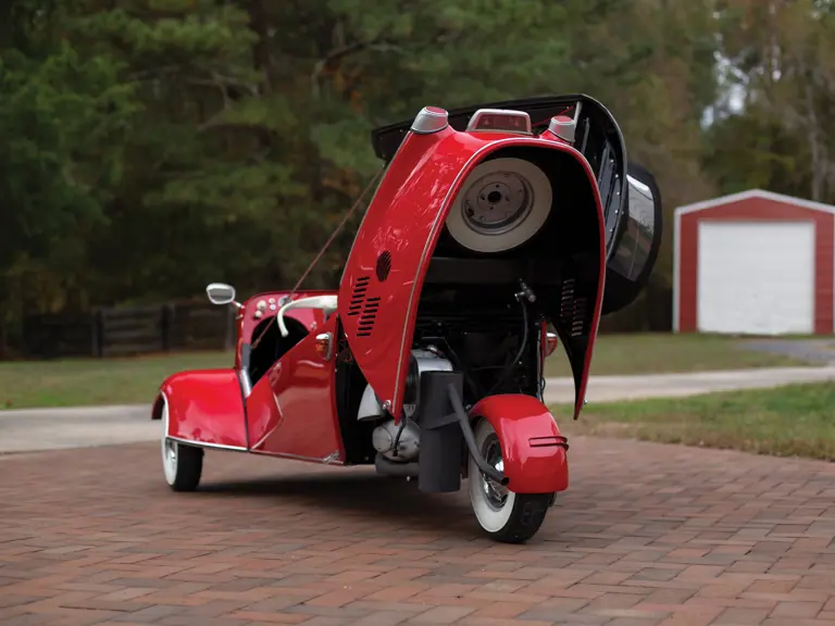 This car is very significant in that it is the second-to-last Messerschmitt ever produced and it is one of these very rare original roadsters. The last car was in fact 80287, which came off the line in August of 1964 and whose whereabouts are unknown today. It is also significant in that it is a very original example of the roadster body style, originally born without the KR 201 special trim, as indicated by its “KR200” data tag. It remained in extremely original and well-preserved condition and in recent years was fully restored to every nut and bolt in the current shade of red we see it in now, complemented by an upgrade to the KR201 snakeskin upholstery and with such accessories as the desirable clock in place as well. It was previously owned by well-known Messerschmitter Dr. Hans Dopjans, whose original German registration is on file. Factory-original Messerschmitt roadsters are among the most collectible of all microcars, and as the second-to-last car to be produced, it maintains special standing among all others.