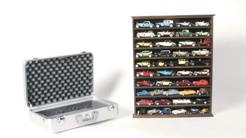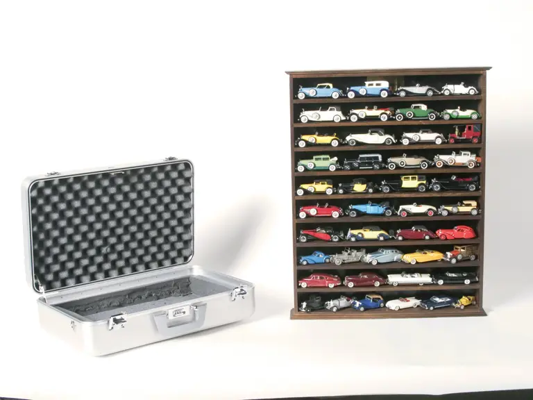 A collection of 43 small scale model cars in a wooden display case and an aluminum-padded brief case. Scale: 1:43