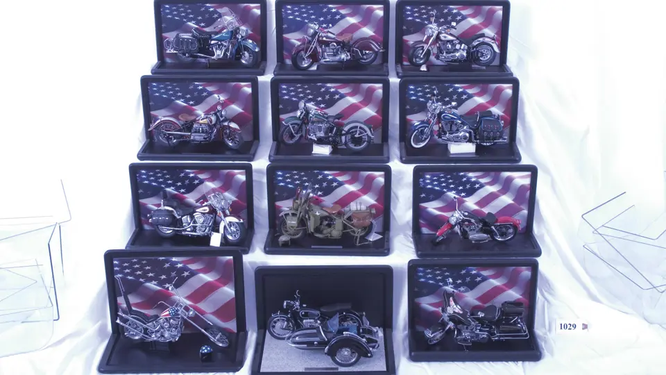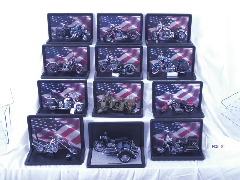 1948 Indian Chief by Danbury Mint, 1942 Indian Model 442 by Franklin Mint (with hang tag), 1998 Harley Davidson Fatboy by Franklin Mint (with hang tag and helmet), 1938 Indian Four by Danbury Mint, 1936 Harley Davidson Knuckle Head by Franklin Mint (with hang tag), 1948 Harley Davidson Heritage Springer by Franklin Mint (with hang tag), Harley Davidson Heritage Softail Classic by Franklin Mint (with hang tag), 1942 Harley Davidson WLA Military Motorcycle by Franklin Mint (with hang tag and helmet), 1957 Harley Davidson Sportster by Franklin Mint (with hang tag), Easy Rider Chopper by Franklin Mint (with hang tag and helmet), 1957 BMW and Sidecar by Franklin Mint (with two hang tags), Harley Davidson Electra Glide by Franklin Mint (with hang tag). All model cars are accompanied by display cases, paper work and/or documentation. Scale: 1:10