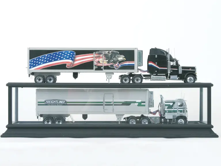 Peterbilt Model 379 and Refrigerated Trailer by Franklin Mint (with hang tag, without case or paper work), 1979 Freightliner and Refrigerated Trailer by Franklin Mint (with hang tag and display case, without paper work). Boxes not included. Scale: 1:32