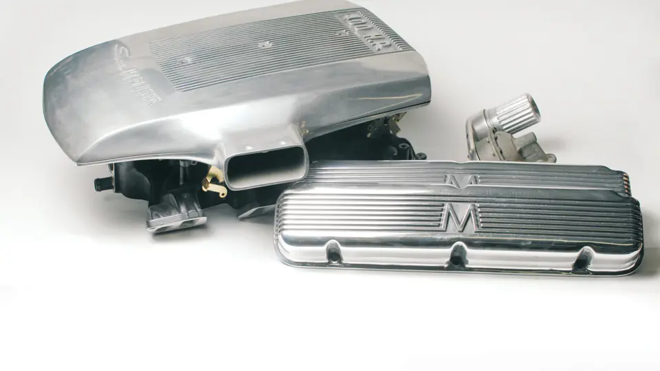 Lot contains an air breather, three two-barrel Holley carburetors, an intake manifold, valve covers and a fuel pump.