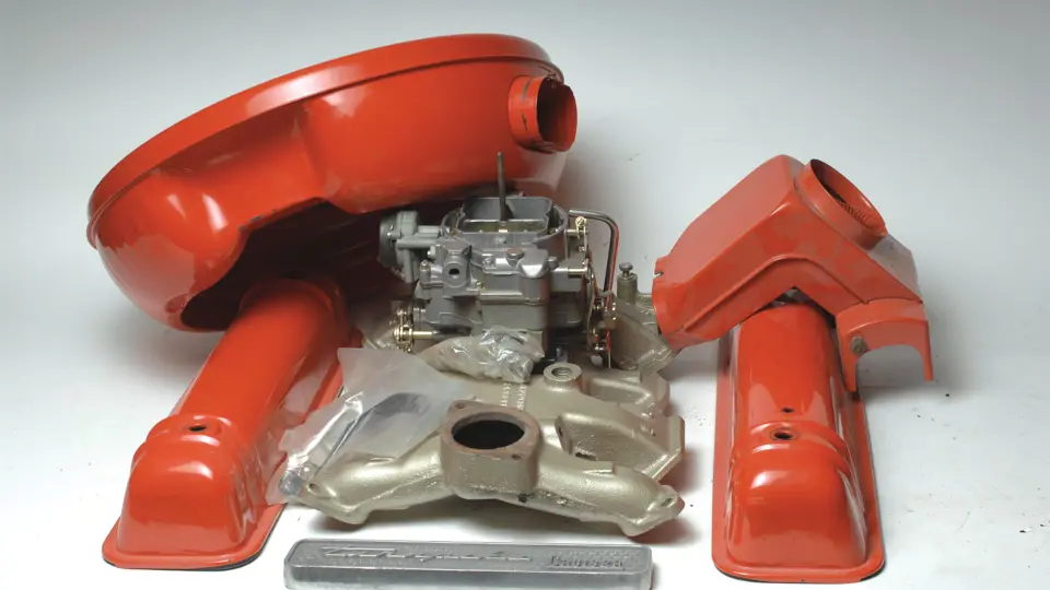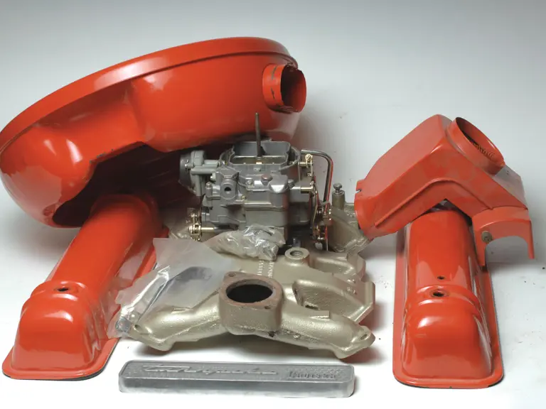 Restored 1957 Mercury Turnpike Cruiser intake manifold, carburetor, air breather, valve covers and valve cover emblem.