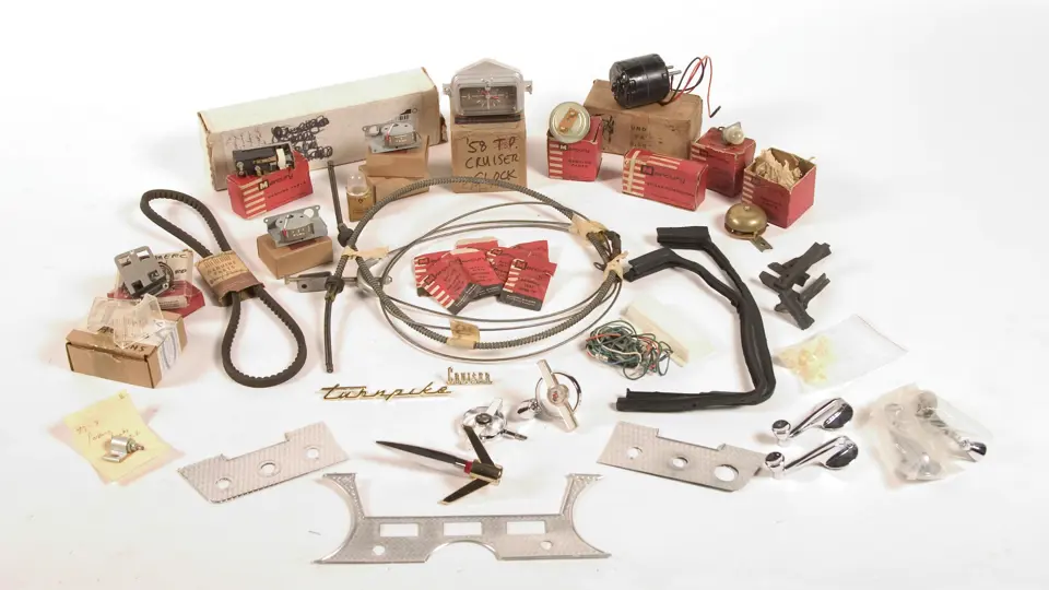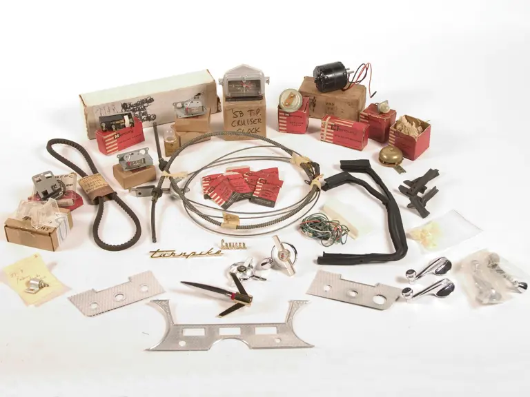 NOS parts include one 1957 Turnpike Cruiser emergency brake cable set, one fan belt, one 1958 hood letter set, a group of new and used turnpike cruiser golden scripts, two temperature gauges and a fuel gauge for a 1958 Mercury, a 1958 Mercury clock, one B6A-18527-D, a dual rear mounted antenna kit, a set of door edge chrome moldings, an accessory antenna, two turn signal switches FEK-14486-A 1957, one dome light lens, one set of 1957-58 vent window weather strips, one pair of 1957-58 quarter window weather strips, two 1957 hood ornaments (one new, one used and damaged), a 1957 Mercury Turnpike Cruiser Indy 500 Pace Car fender ornament, a 1958 headlight switch FEW-11654-C, a 1958 starter safety switch FEW-11516-A1, a 1958 glove box light assembly FEK-18212-A 1958, a 1952-57 license plate lens, one complete set of power window switch knobs for a 1957-58 Turnpike Cruiser, one set of four 1957-58 re-chromed window winder handles, one parking brake switch, a pair of 1957 Mercury transmission keyboard face-plate FEK-16821-CF, a pair of 1957 backup light lenses, one 1958-59 speed warning bell. Used parts include miscellaneous dash knobs, one 1957 cove molding, one three piece set of spun aluminum dash panels for a 1957 Turnpike Cruiser, a set of 1957 Turnpike Cruiser parking light lenses among other miscellaneous parts.