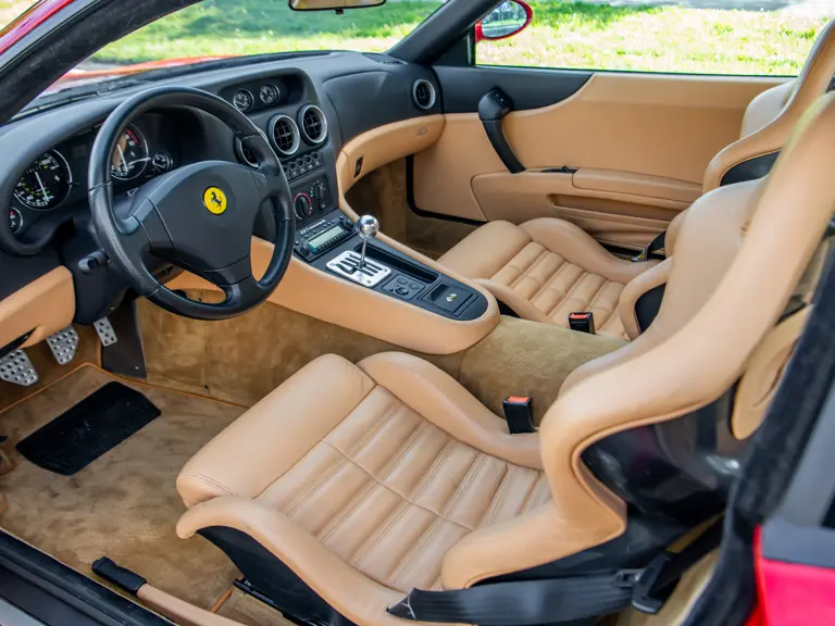 Delivered new via the noted Ron Tonkin Gran Turismo of Wilsonville, Oregon in October 2021, this 550 Maranello was finished in classic Rosso Corsa with optional Scuderia Shields on the fenders; black brake calipers are visible behind silver-painted five-spoke wheels. Its interior was specified in Beige with Castoro (light brown) carpets. Notably, the cabin is desirably equipped with carbon fiber-backed racing style seats, neatly trimmed in Beige Connolly leather, in size large.