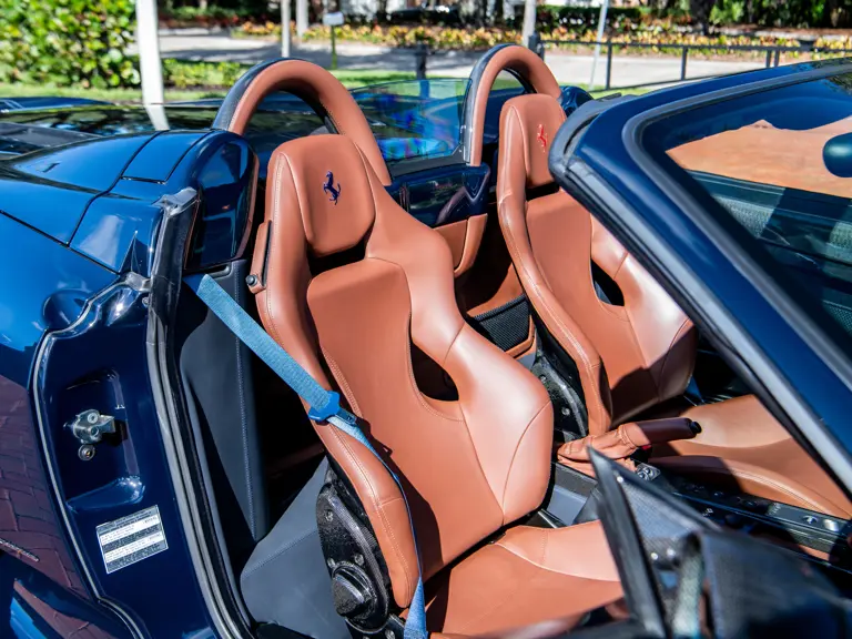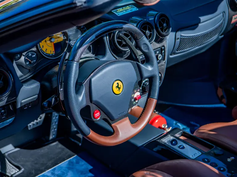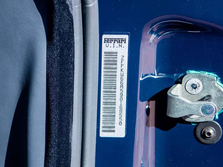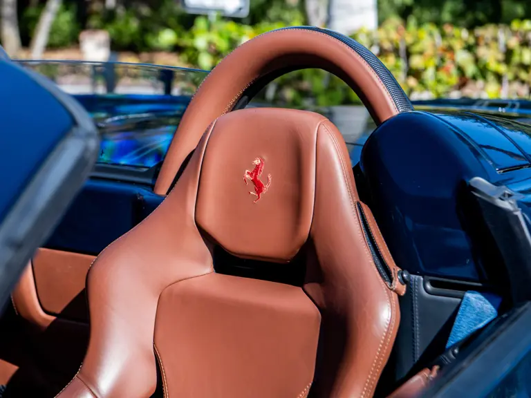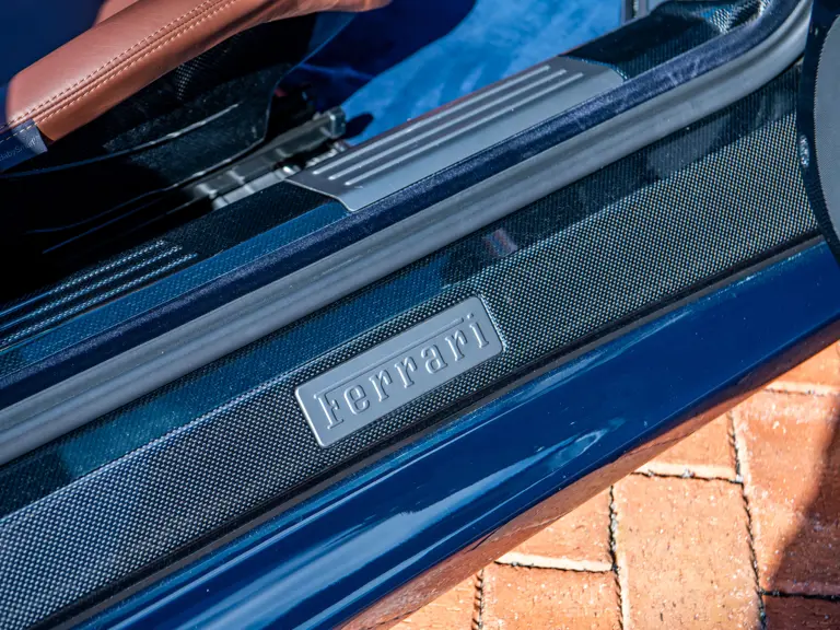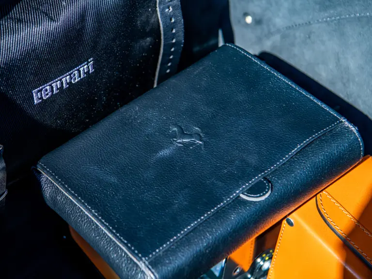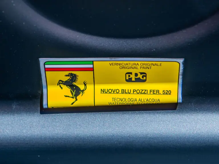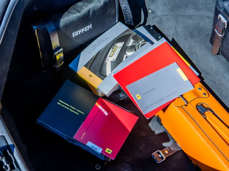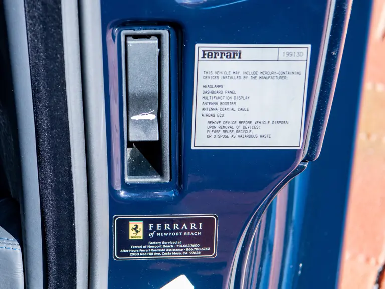 The majority of 16Ms delivered to the United States were finished in some variant of Rosso. Thus, the example offered here is surpassingly rare, having been specified for its original California owner in the striking combination of Blu Pozzi over Terra Bruciata interior, believed to be the only US car so-liveried, with Argento Nürburgring and Nero painted body stripe. Its window sticker, included in the file, notes over $18,000 in “Special Features,” in addition to full leather upholstery; color-coordinated Blu Scuro leather dashboard, steering wheel, and Cuoio stitching; contrasting-colored embroidered headrest logos, with the driver’s side orange and the passenger side purple; and radio-navigation system with Bluetooth. Well-kept since new, including a service by Ferrari of Newport Beach, California in 2024 and further attention by Ferrari of Naples, Florida in 2025, it recorded 5,941 miles at the time of cataloguing. It is accompanied by its original books, tools, and service documents.