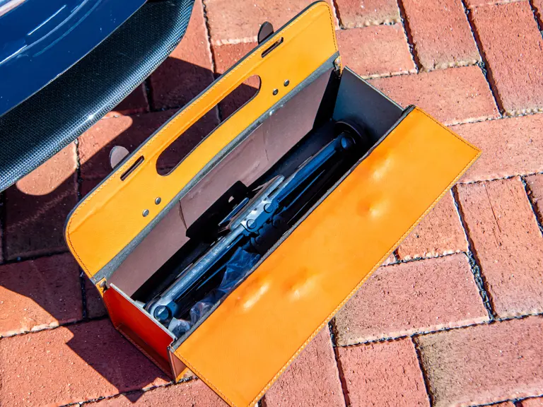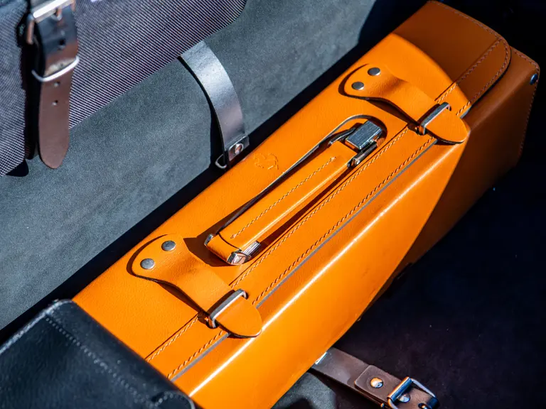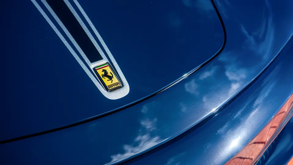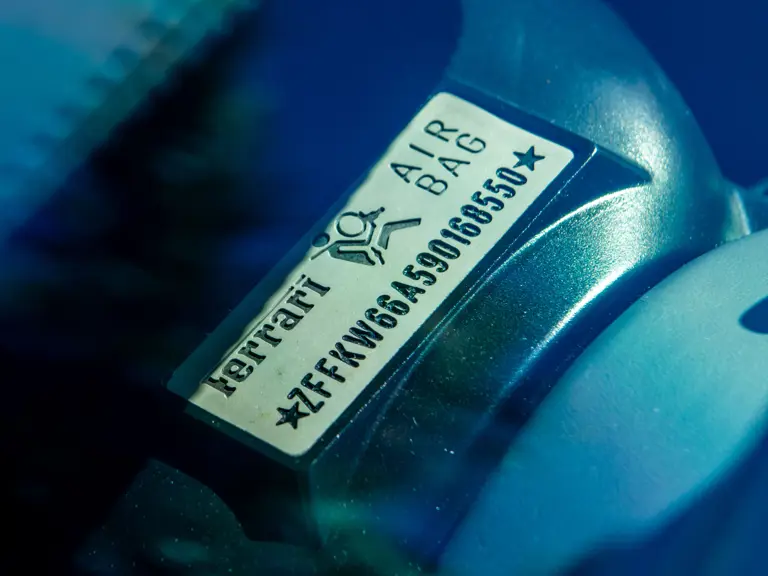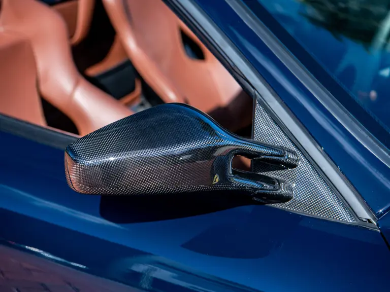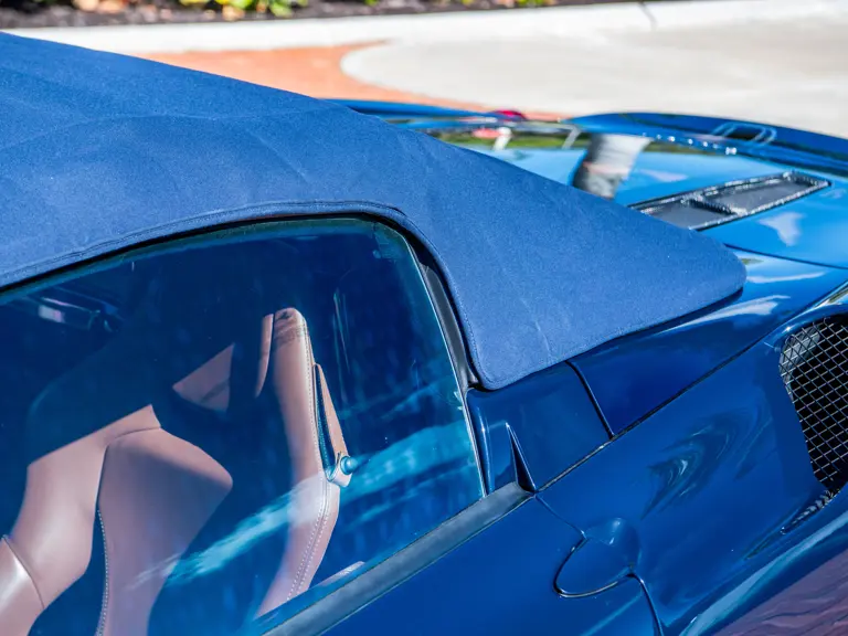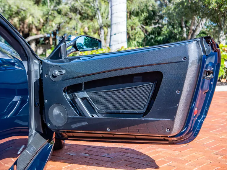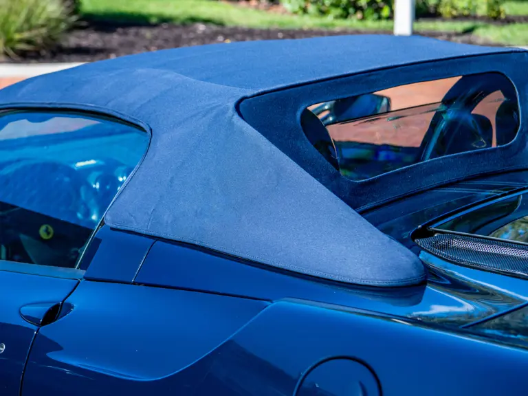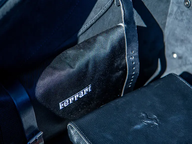 The majority of 16Ms delivered to the United States were finished in some variant of Rosso. Thus, the example offered here is surpassingly rare, having been specified for its original California owner in the striking combination of Blu Pozzi over Terra Bruciata interior, believed to be the only US car so-liveried, with Argento Nürburgring and Nero painted body stripe. Its window sticker, included in the file, notes over $18,000 in “Special Features,” in addition to full leather upholstery; color-coordinated Blu Scuro leather dashboard, steering wheel, and Cuoio stitching; contrasting-colored embroidered headrest logos, with the driver’s side orange and the passenger side purple; and radio-navigation system with Bluetooth. Well-kept since new, including a service by Ferrari of Newport Beach, California in 2024 and further attention by Ferrari of Naples, Florida in 2025, it recorded 5,941 miles at the time of cataloguing. It is accompanied by its original books, tools, and service documents.