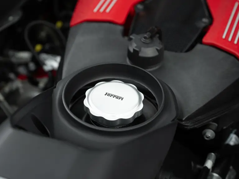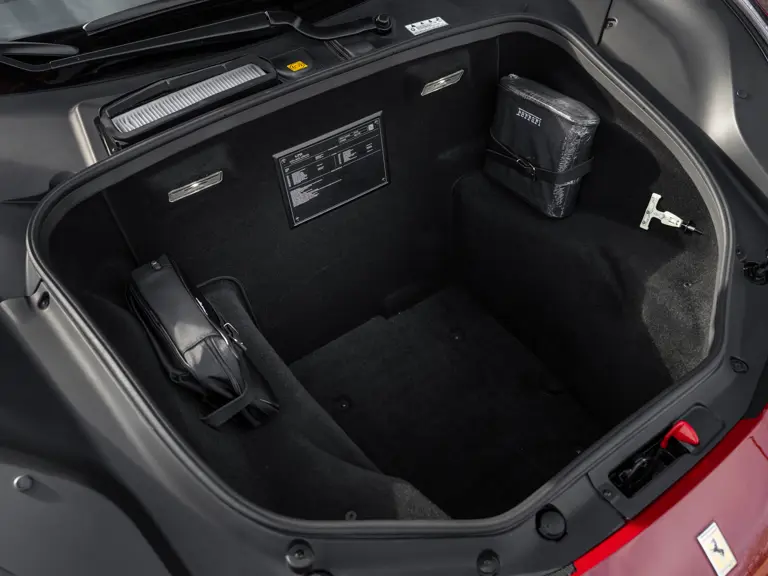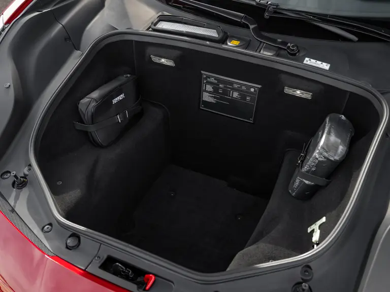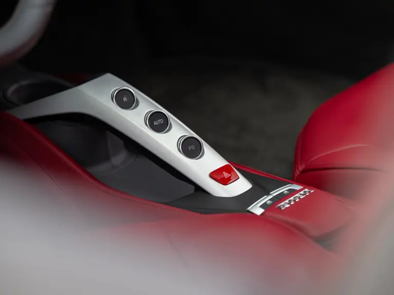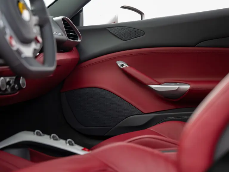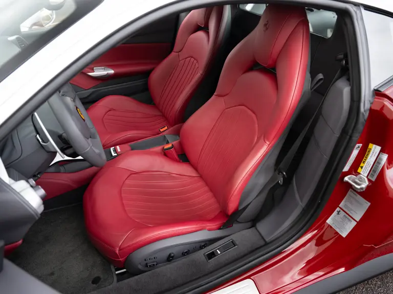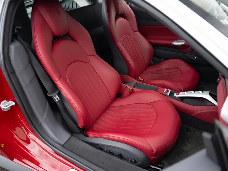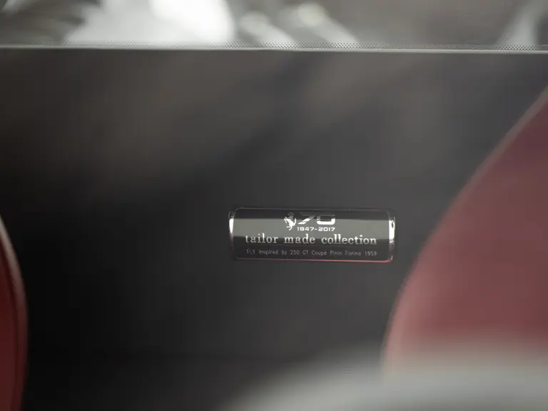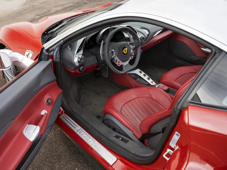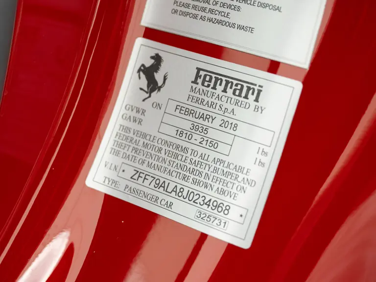 The distinctive color scheme on this one-of-one 2018 Ferrari 488 GTB 70th Anniversary takes inspiration from the landmark 1959 Ferrari 250 GT Pinin Farina Coupe’s signature livery of Rosso Bordeaux with Grigio Conchiglia roof. It is the 26th color combination in the commemorative series and is named “Some Like it Red” after the Marilyn Monroe 1959 film Some Like it Hot. Ferrari Tailor Made reinterpreted this timeless color scheme for 70th Anniversary models with an exterior color combination of Rosso Mugello and contrasting Argento Nürburgring roof and mirror caps, as seen on the 488 GTB offered here. Various exterior ducts, grilles, and flaps were finished in Matte Black as part of the 70th-anniversary treatment. Meanwhile, the two-tone interior combines Charcoal elements with deep plum Vinaccia leather upholstery on the doors and seats, which feature a vertical ribbed pattern typical of classic GT cars. Tone-on-tone stitching, embroidered logos on the headrests, aluminum elements in Argento Nürburgring, and a 70th-anniversary dedication plate further dress the cabin.
