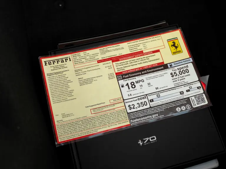 Delivered new to Algar Ferrari of Philadelphia, this 488 GTB 70th Anniversary carried a suggested retail price of $390,306 when new, which included $133,756 of 70th-anniversary particulars, factory options, and other special features. Other notable factory options include front and rear parking sensors, Ferrari shields, white rev counter, 20-inch forged “Diamond” rims, and fully electric seats.