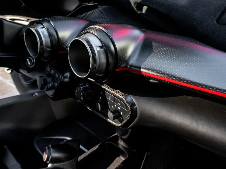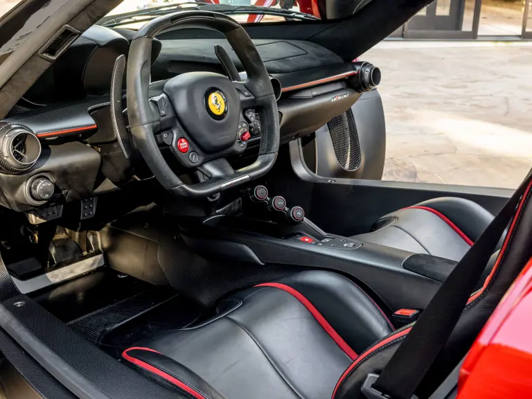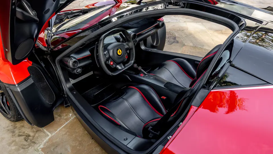 This handsomely presented LaFerrari benefits from a life of modest driving use through just two ownerships, the latter of which transpired for eight years in the forgiving climate of California. According to an original window sticker on file, and as corroborated by its authenticating Ferrari Classiche Yellow Book (the birth-book Classiche documentation that accompanies special limited-edition flagship Ferraris), chassis number 211999 was optioned with matte carbon fiber, carbon fiber wheel-center caps, dashboard with carbon fiber livery, and Prancing Horse-stitched headrests.