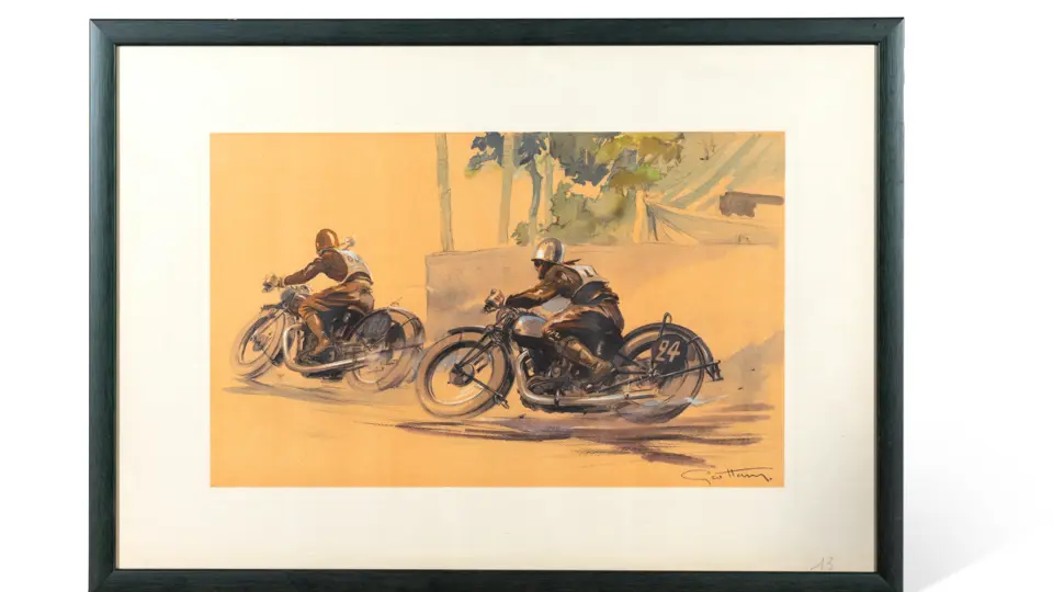 Geo Ham (Georges Hamel) lithographic print depicting two motorcycles at speed, framed and glazed. 30 x 48 cm (12 x 19 in).