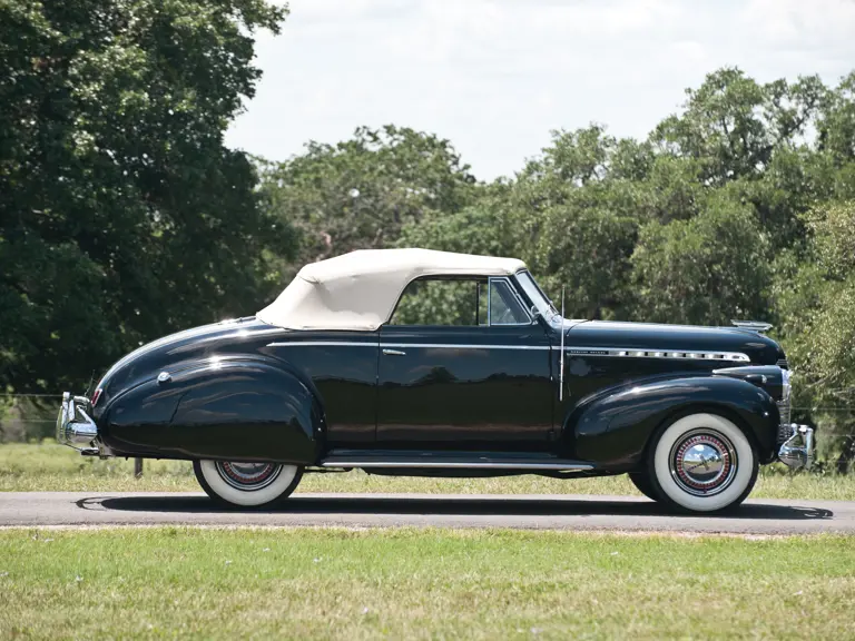 New to Chevrolet in 1940 was the Special DeLuxe series. More sumptuously appointed than any previous Chevrolet, it was distinguished by a stainless steel hood and belt trim, along with such amenities as dual wipers, dual horns, a 30-hour dashboard clock, and a deluxe steering wheel with a horn ring. Perhaps surprisingly, the newcomer proved to be, by a wide margin, Chevy's best seller. Joining the Charlie Thomas Collection in 2007, this convertible has much to offer. Most notably, the rich red leather interior and upholstery is of high quality and is complemented by the two-tone wood grained dash and the very desirable steering wheel with an internal spinner mechanism. The black exterior finish is thin in places but still continues to shine. The undercarriage has also been restored and only shows light road use. With fender skirts, a GM spotlight, and bumper wings, this convertible stands out as Chevrolet’s top of the line offering.