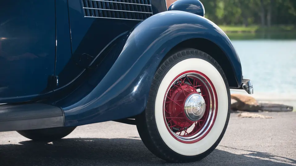 Few Ford enthusiasts would dispute Ford’s claim of “Greater Beauty, Greater Comfort, and Greater Safety” for its 1935 models. The narrower radiator grille lost its sharply vee’d base, and four horizontal bars helped accentuate the 1935 model’s new, lower and more streamlined appearance. In profile, the Ford windshield was seen to be more sharply sloped than before. DeLuxe models had bright windshield and grill trim work, as well as dual exposed horns and twin taillights.