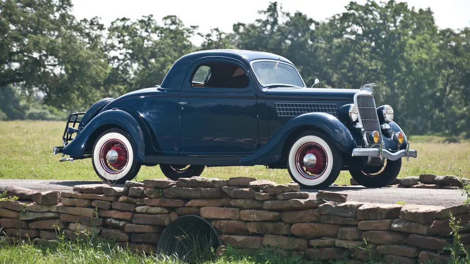 This three-window coupe possesses tremendous character and beauty. Presented in rich Washington Blue, it benefited from a high-point restoration some years ago and continues to present extremely well. The paint is exceptional, complemented by a DeLuxe interior, wide whitewall tires, a Ford luggage rack, dual horns, and fog lamps. The brown mohair interior is in very nice condition, complete with such features as a banjo wheel, rearview mirror with Ford clock, AM radio, under dash Ha-Dees heater, and roll-down back glass with a roller blind. The engine compartment and underside were both properly restored and show little road use. Given its outstanding presentation, this three-window coupe certainly warrants close attention and presents endless opportunities for its next owner, be it on the show field or at any number of driving events.