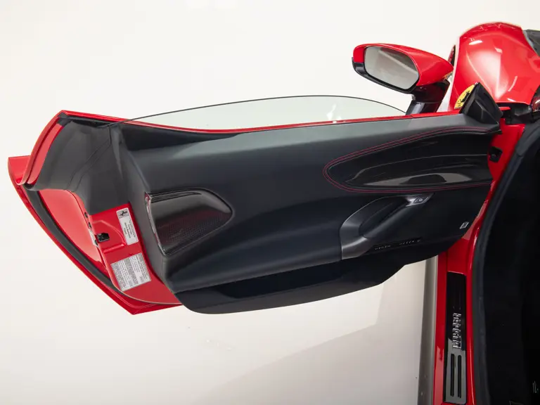 This example was completed in February 2021 and delivered new to the Dare to Dream Collection finished in a classic Ferrari scheme featuring a Rossa Corsa exterior over a Nero leather interior. As seen on the Personalization Specification plaque in the trunk, the car features a number of optional extras resulting in a unique and special appearance. Inside, carbon fiber is utilized for the driver zone, rear shelf, door panels, upper center console, and dash inserts. A Nero dashboard is complemented by red stitching throughout, while the electric seats with Cavallinos on the headrests are finished with a red center stripe. The exterior features forged wheels with titanium wheel bolts and carbon fiber hub caps over red brake calipers. Convenience options include a suspension lifter and an advanced front driving camera. Today, the vehicle shows in remarkable, essentially new condition with just 1,371 kilometers (~852 miles) showing on the odometer at the time of cataloguing. It is accompanied by a battery charger, tools and tire inflator, owner’s manual, and delivery presentation box with partial contents.