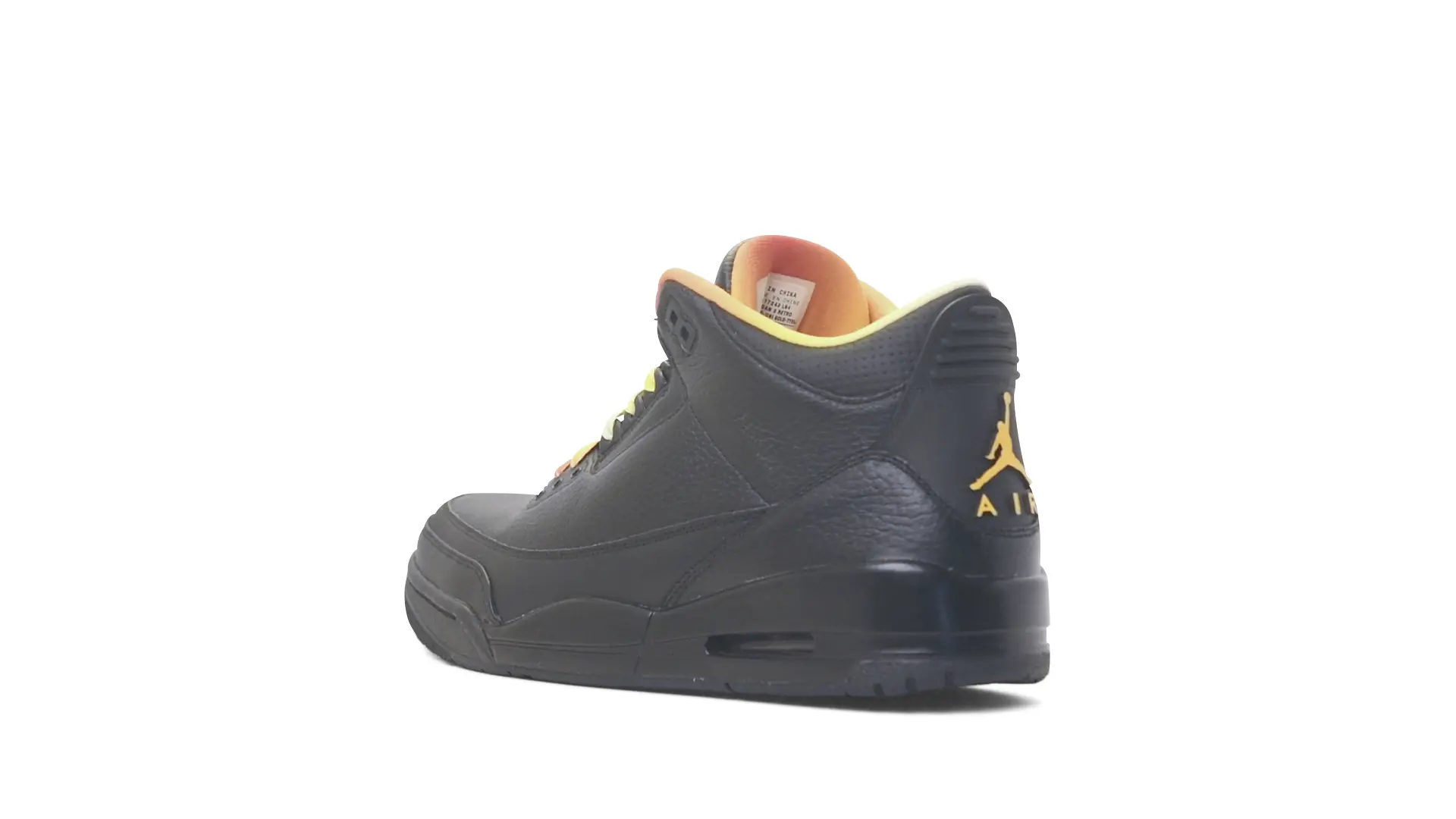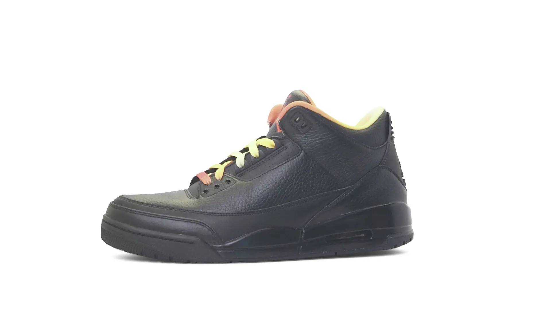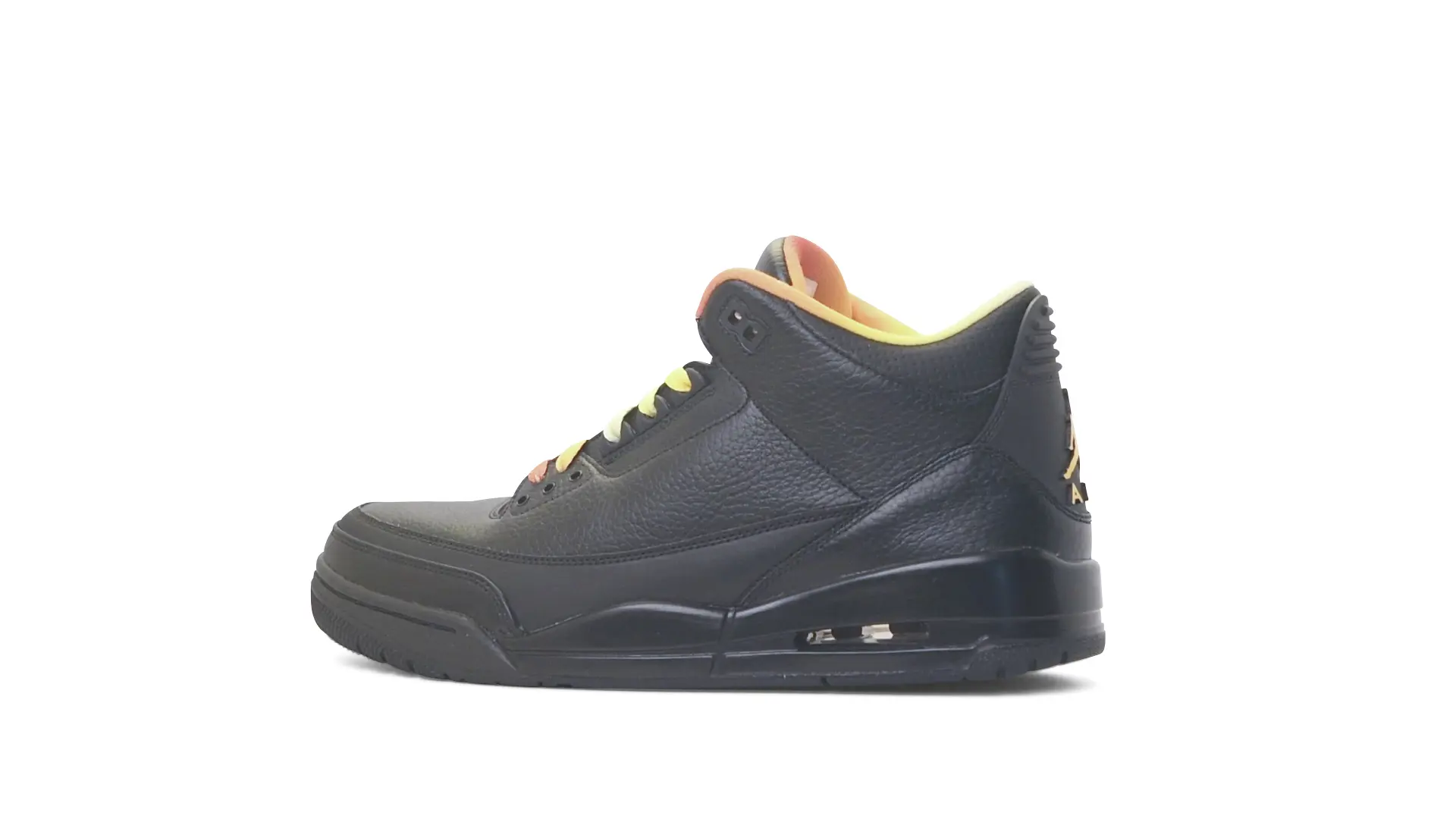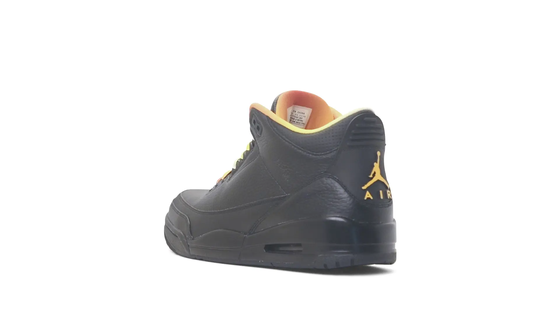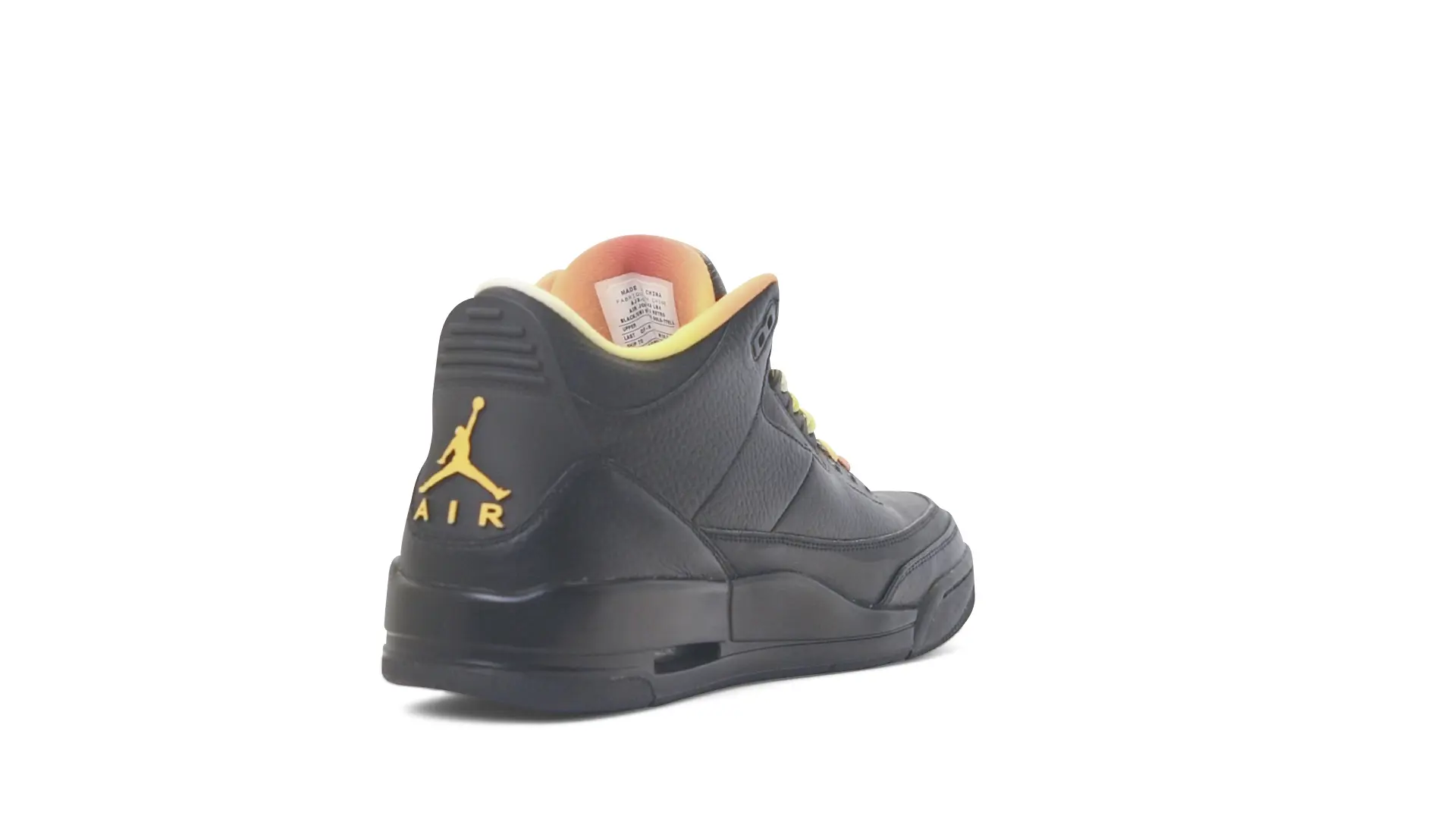 This Air Jordan 3 ‘ Drake vs Lil Wayne’ features a combination of tumbled and smooth black leather dominating the upper, accented by pops of orange and yellow on the laces and collar lining. Notably, the insole showcases a unique 'Drake vs. Lil Wayne' graphic, adding a personal touch to commemorate the tour and their partnership.