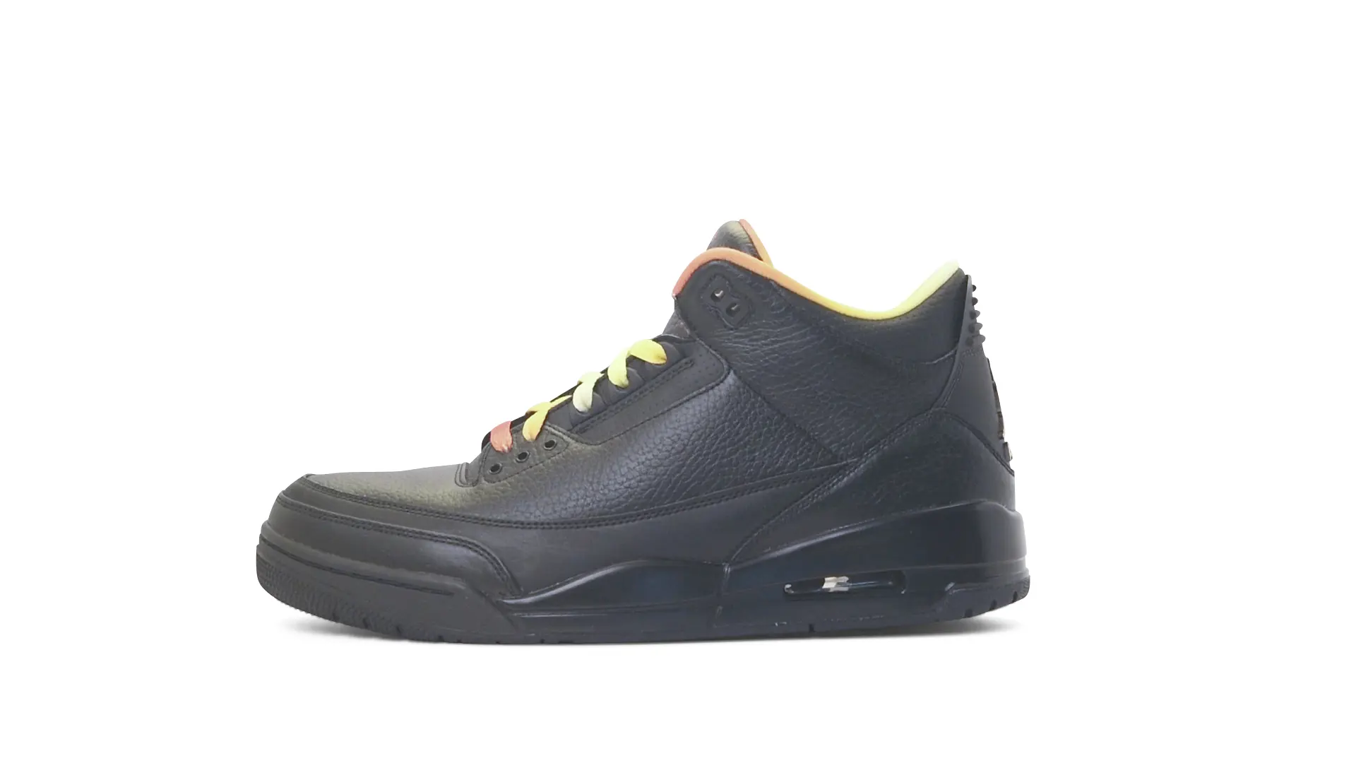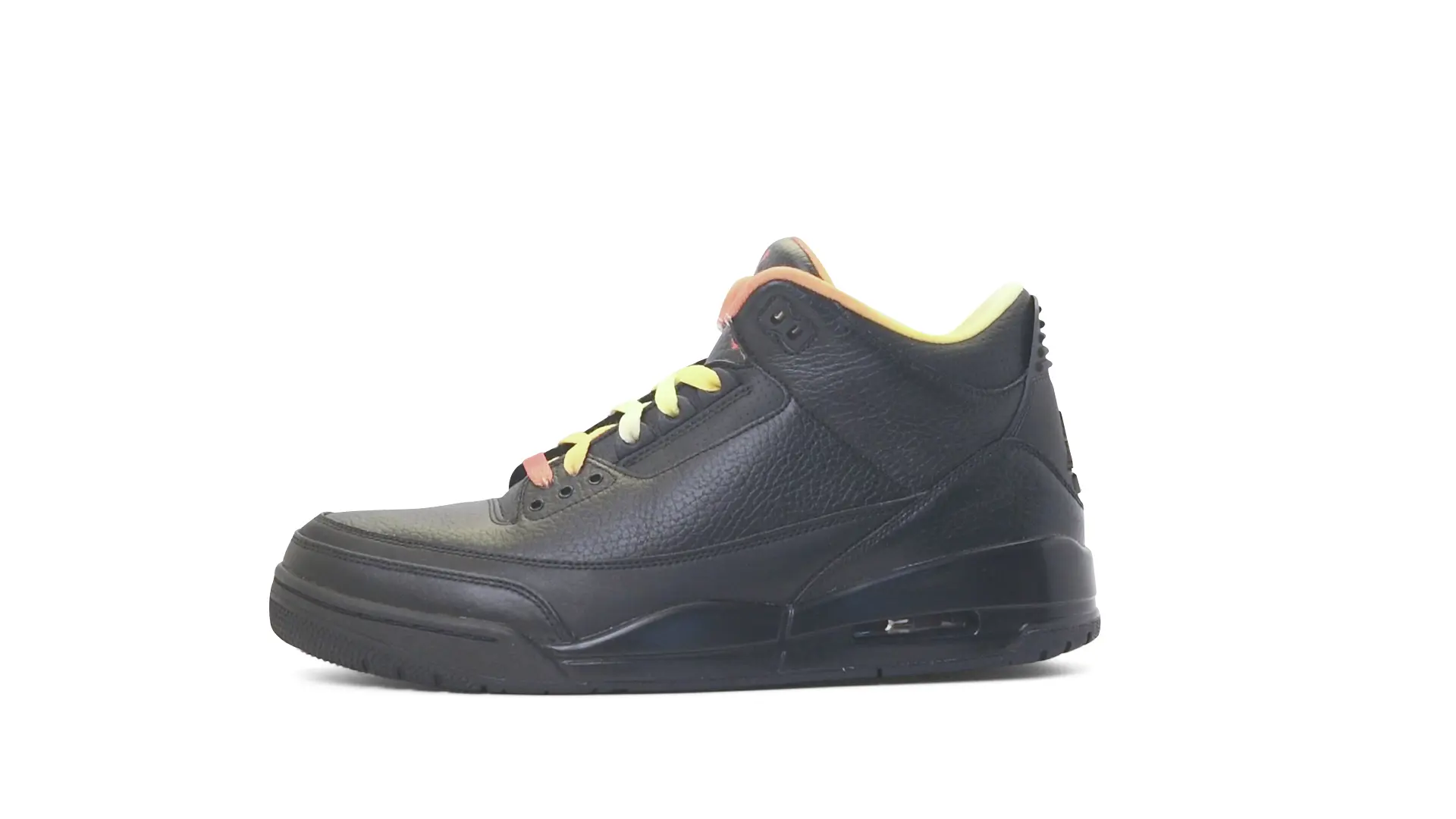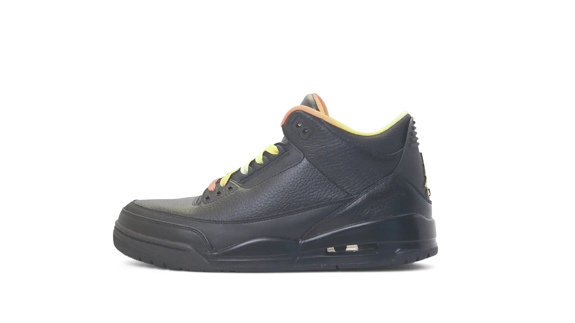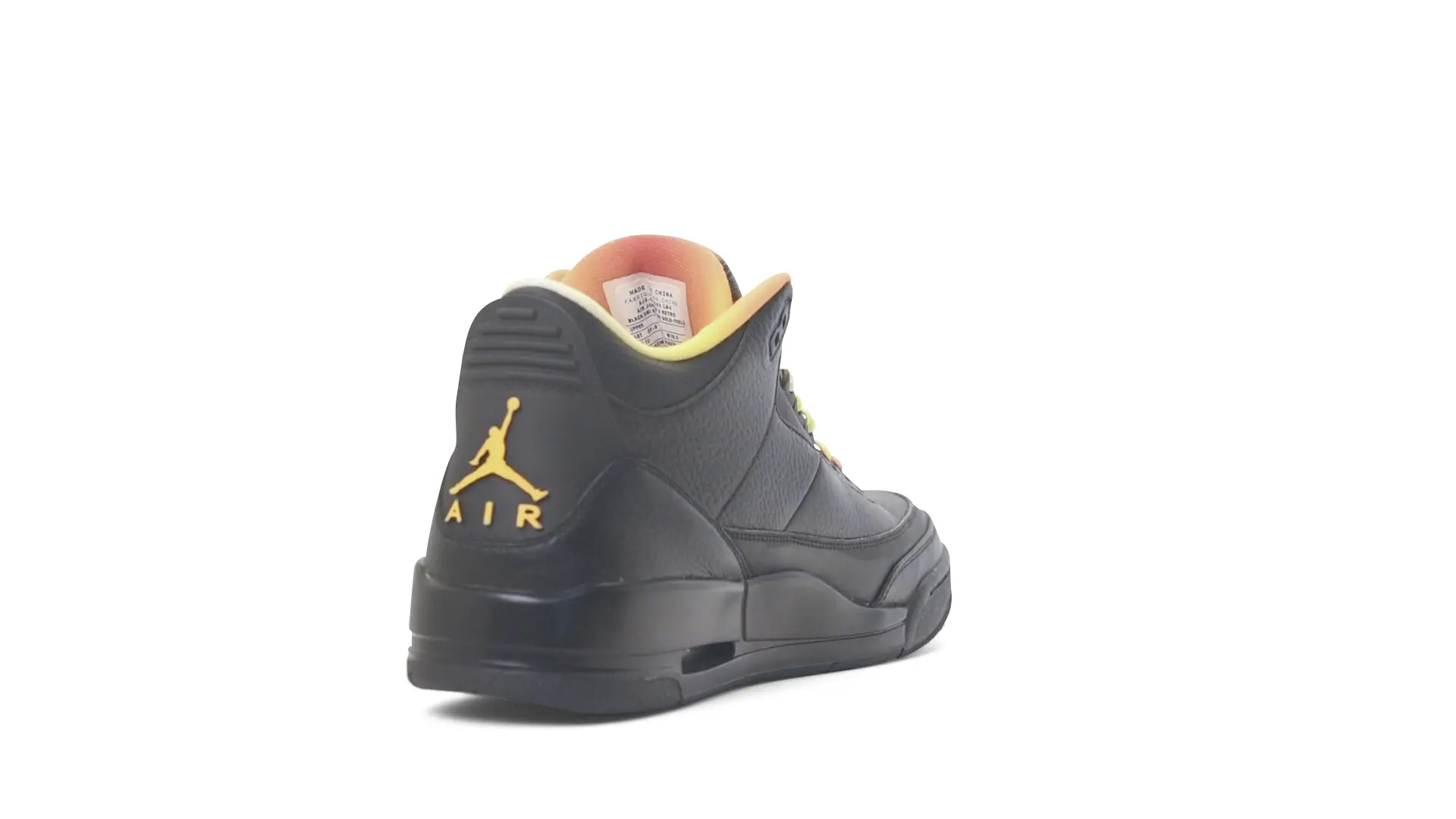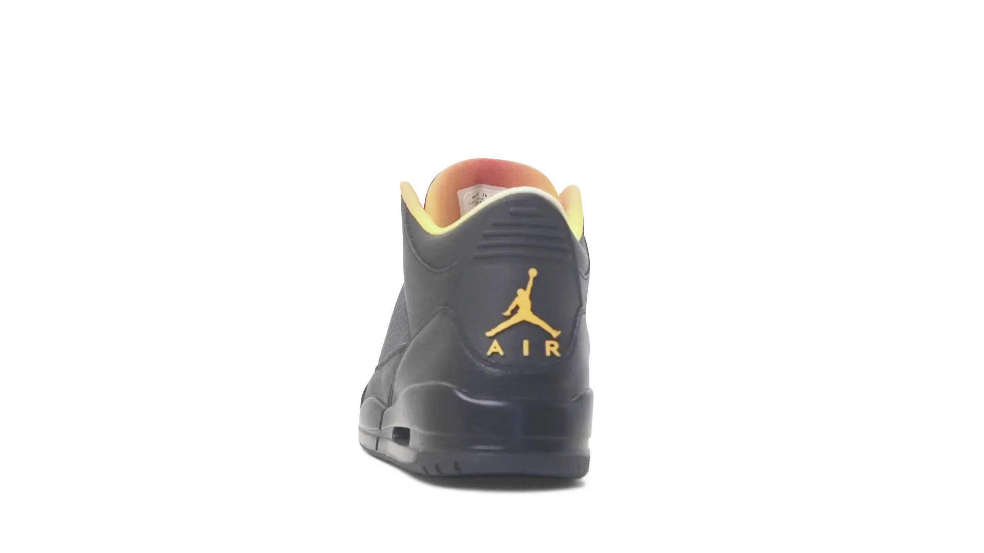 This Air Jordan 3 ‘ Drake vs Lil Wayne’ features a combination of tumbled and smooth black leather dominating the upper, accented by pops of orange and yellow on the laces and collar lining. Notably, the insole showcases a unique 'Drake vs. Lil Wayne' graphic, adding a personal touch to commemorate the tour and their partnership.