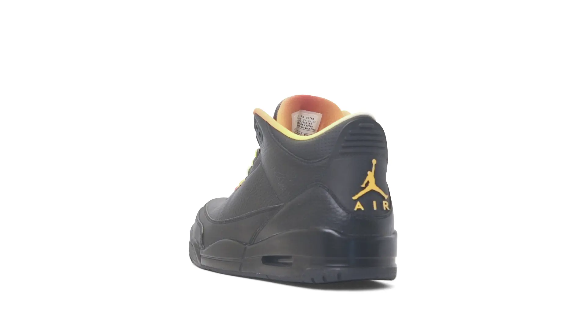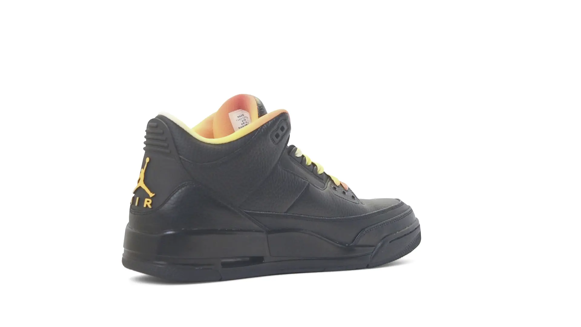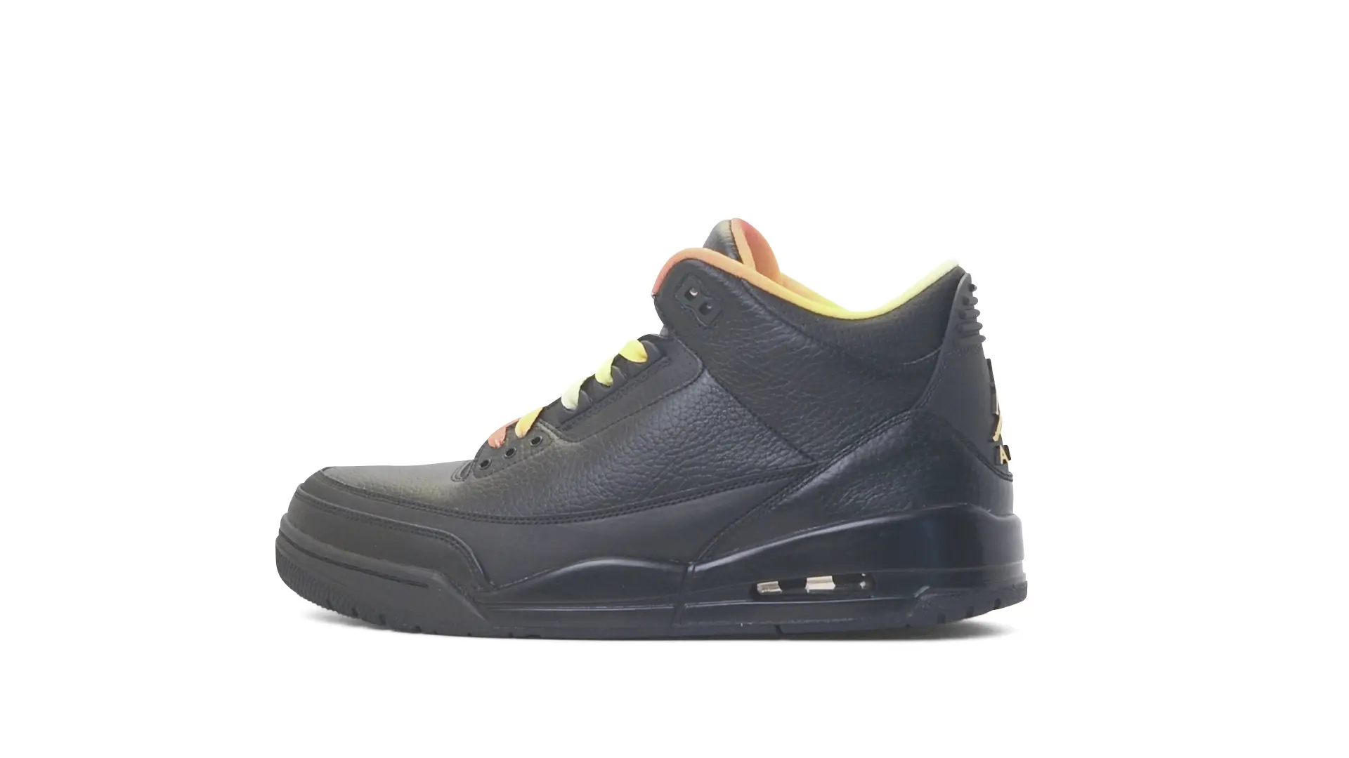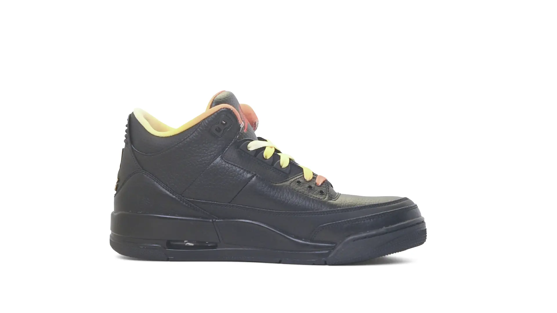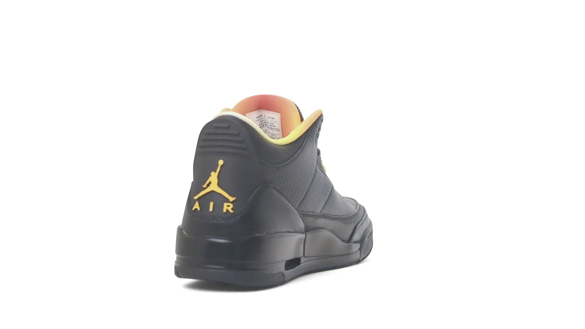 This Air Jordan 3 ‘ Drake vs Lil Wayne’ features a combination of tumbled and smooth black leather dominating the upper, accented by pops of orange and yellow on the laces and collar lining. Notably, the insole showcases a unique 'Drake vs. Lil Wayne' graphic, adding a personal touch to commemorate the tour and their partnership.