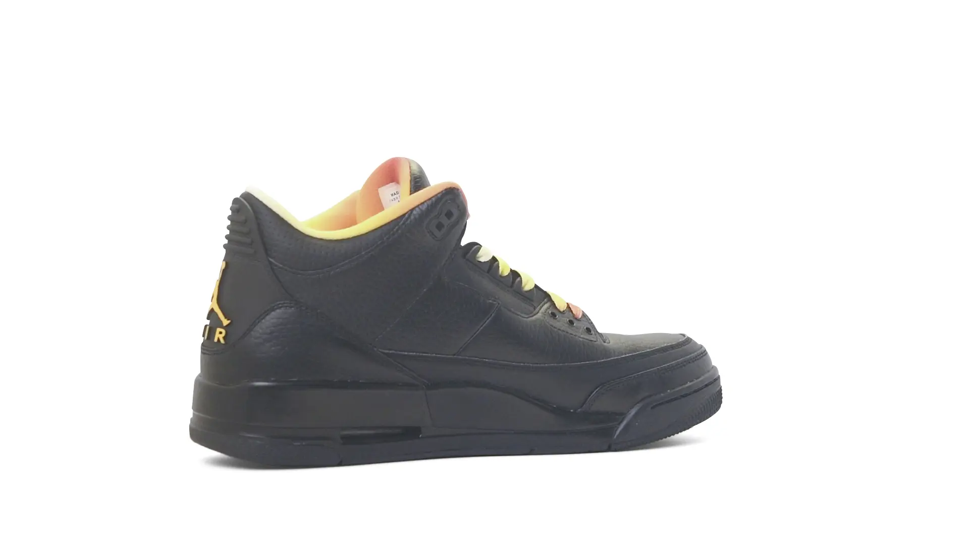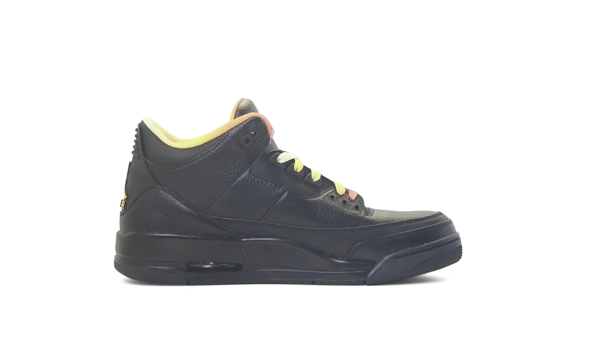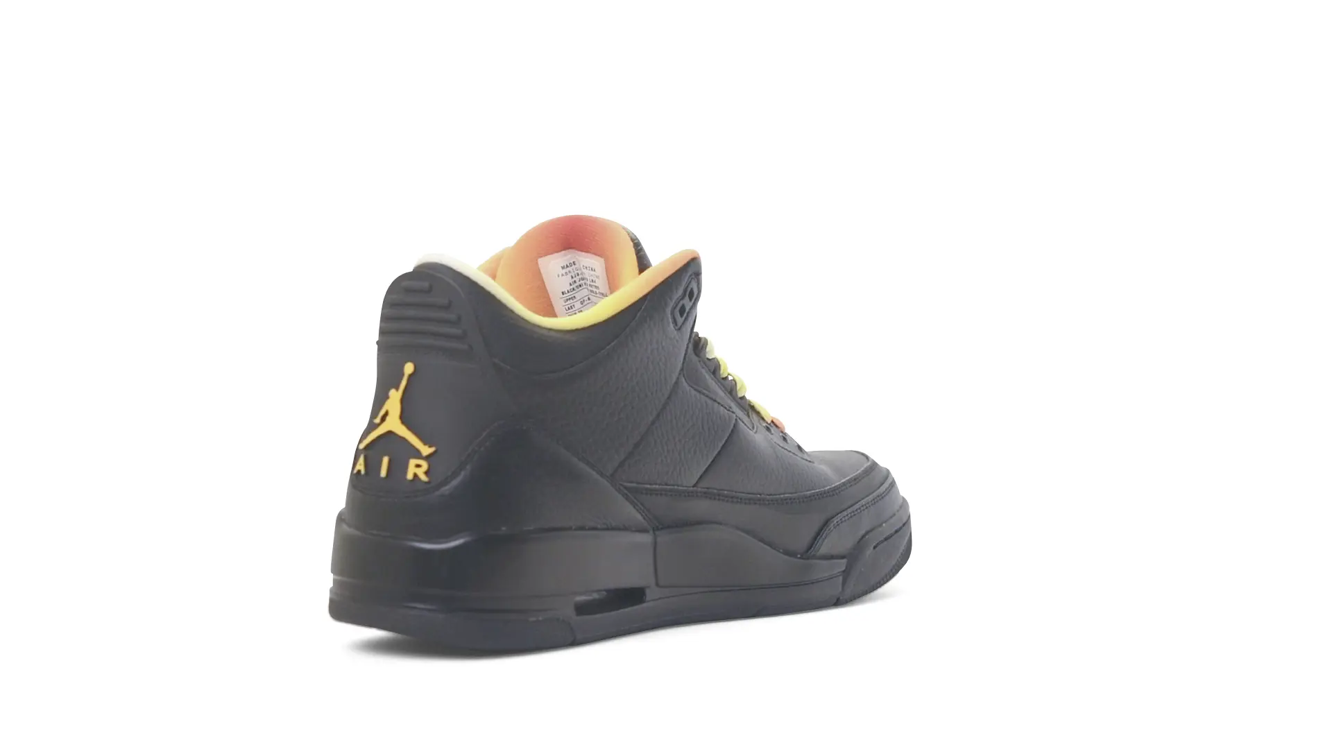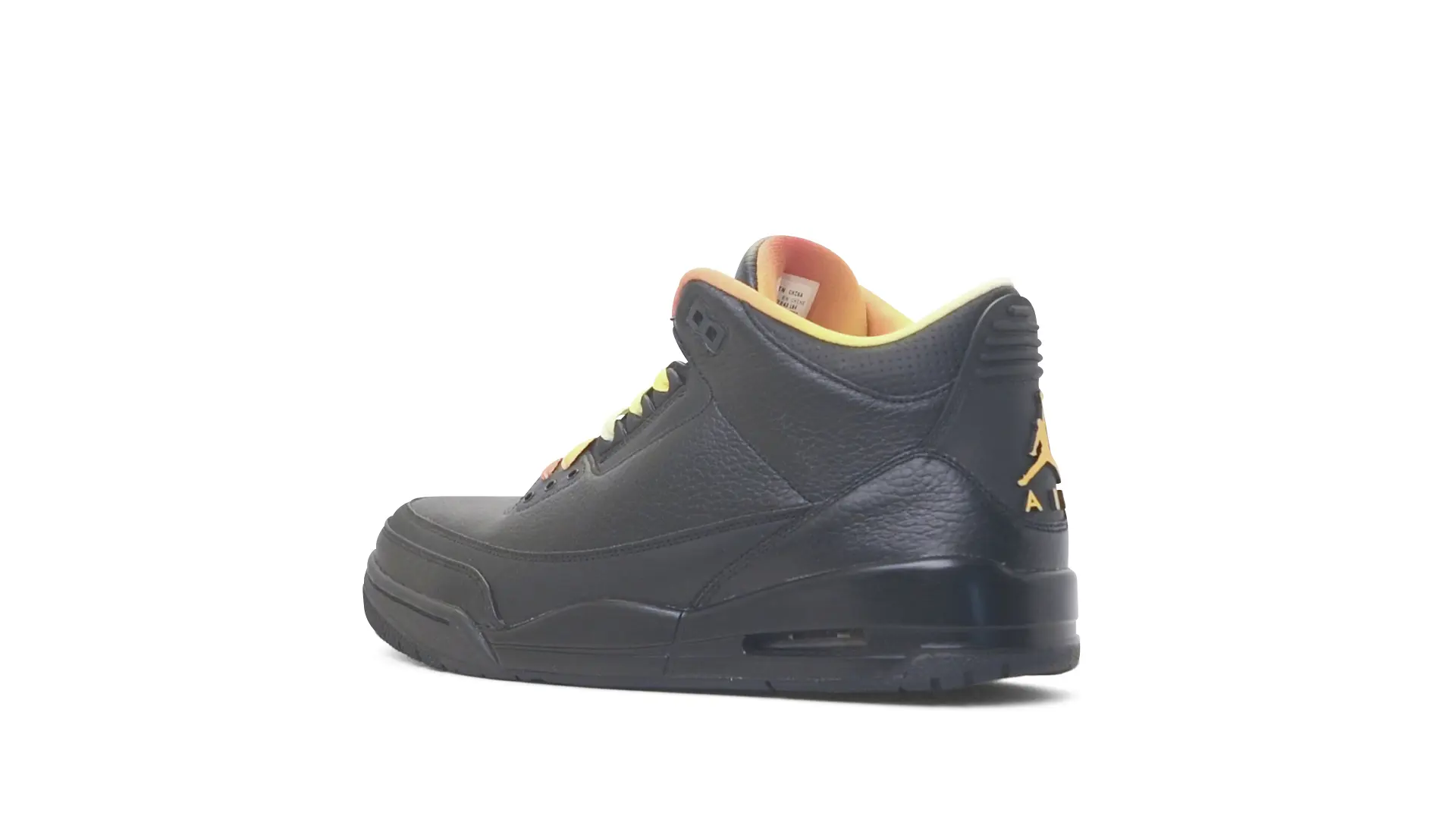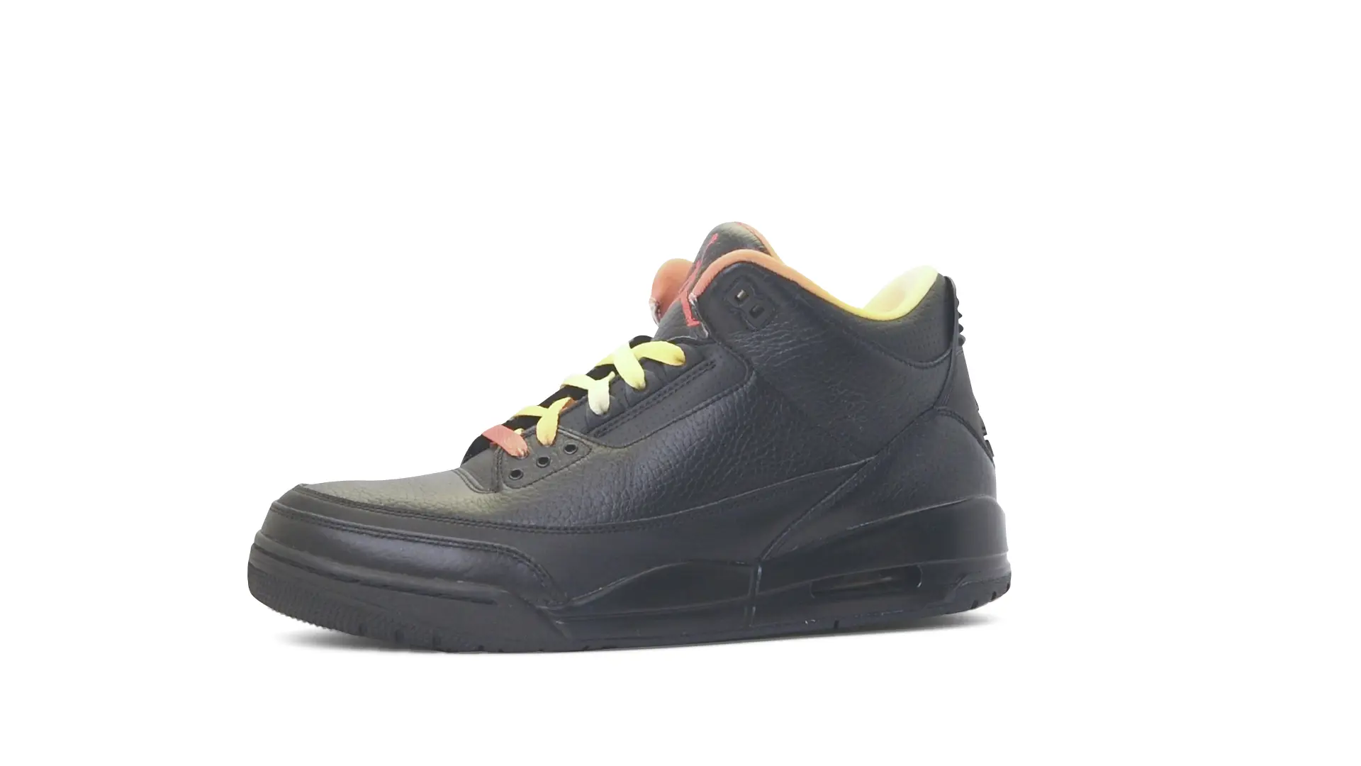 This Air Jordan 3 ‘ Drake vs Lil Wayne’ features a combination of tumbled and smooth black leather dominating the upper, accented by pops of orange and yellow on the laces and collar lining. Notably, the insole showcases a unique 'Drake vs. Lil Wayne' graphic, adding a personal touch to commemorate the tour and their partnership.